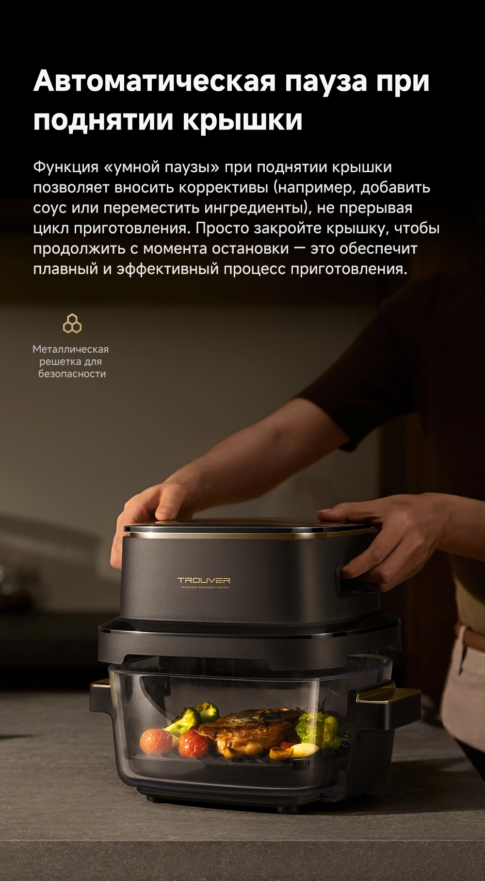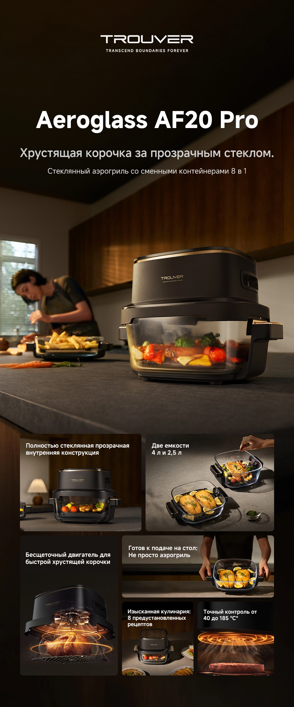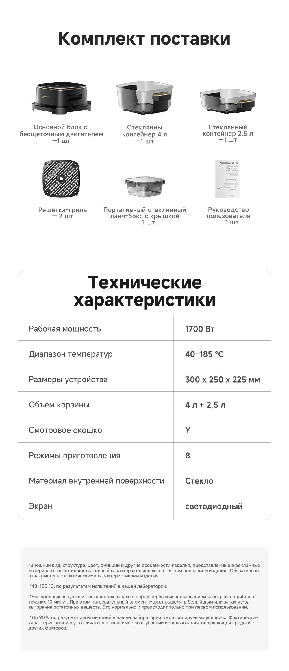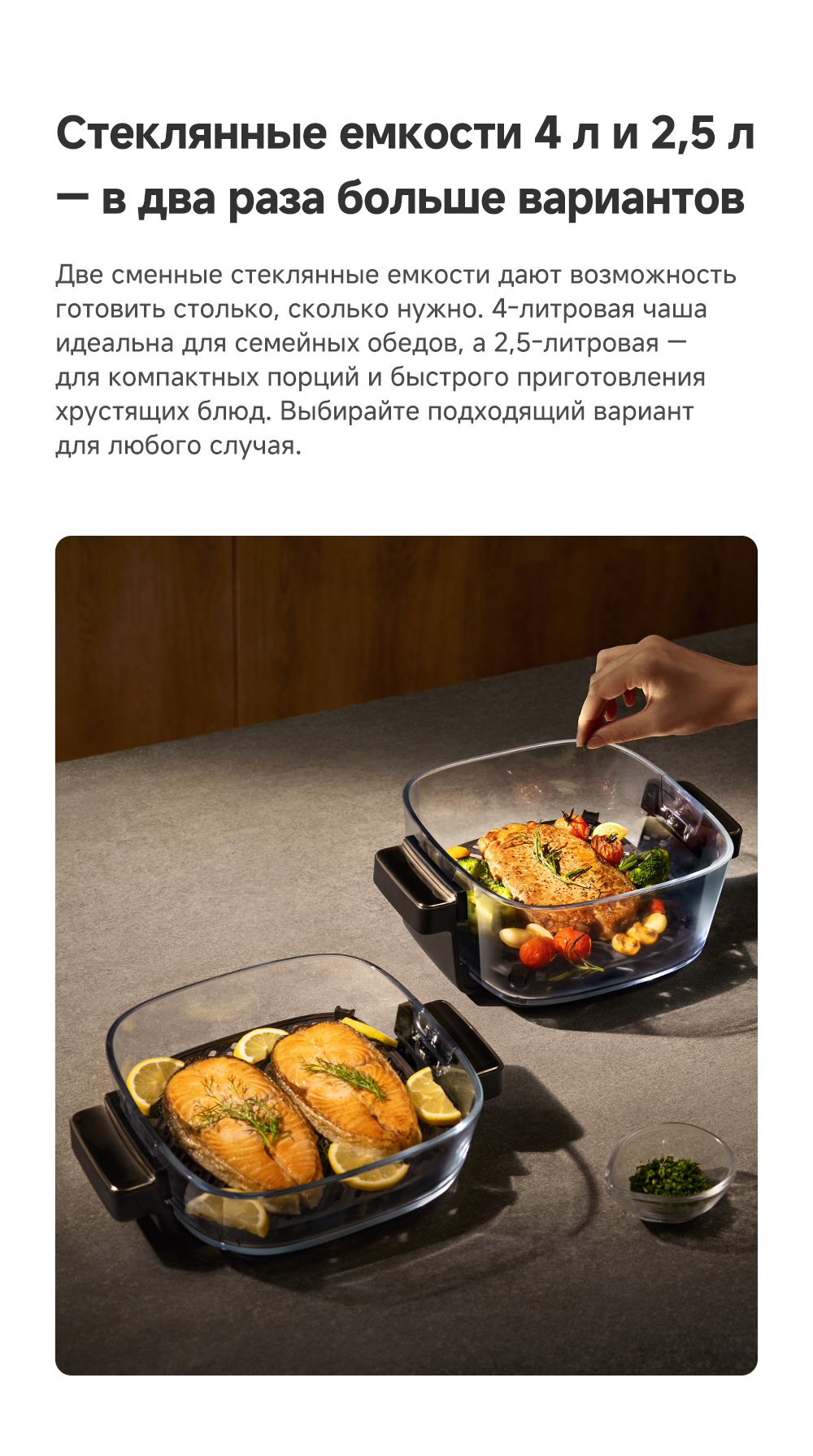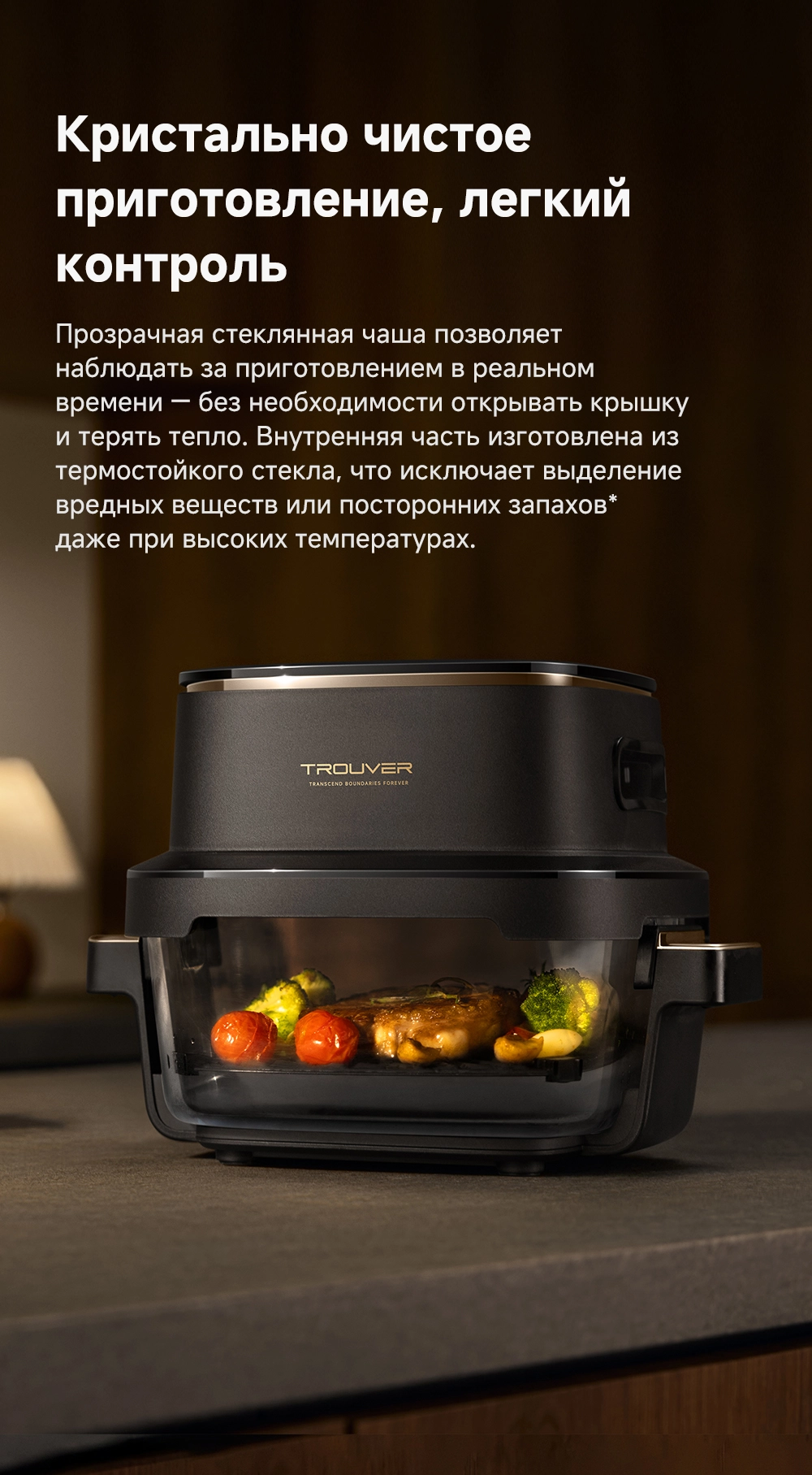 - Особенности: две чаши объемом 4 л и 2.5 л. Полностью стеклянная нижняя часть позволяет визуально контролировать приготовление пищи. Точное управление в диапазоне от +40 °С до +185 °С