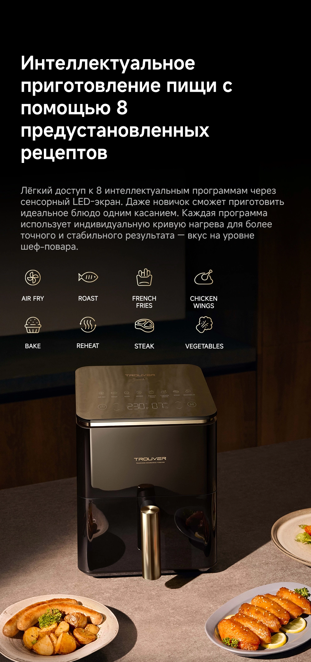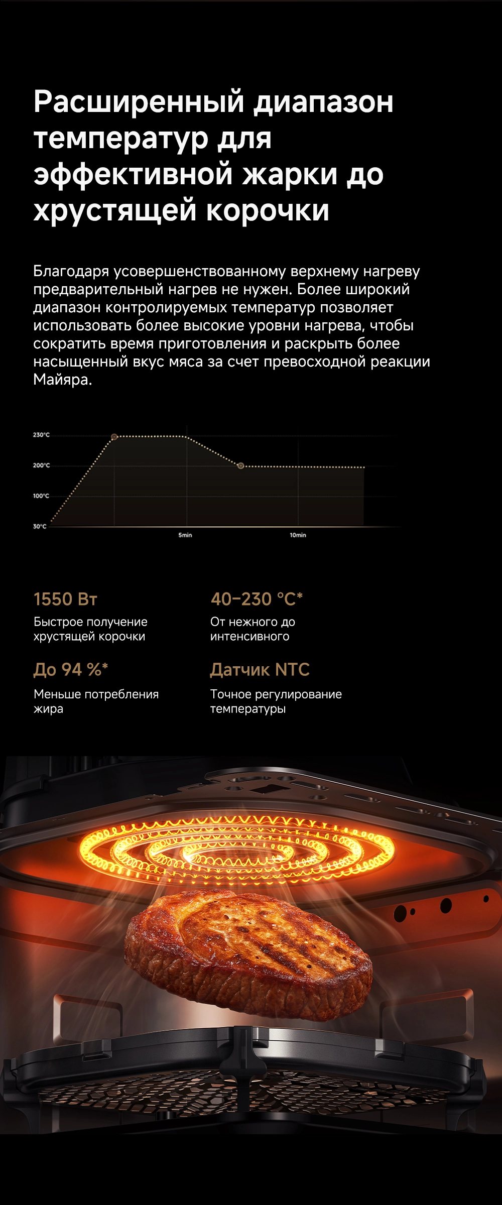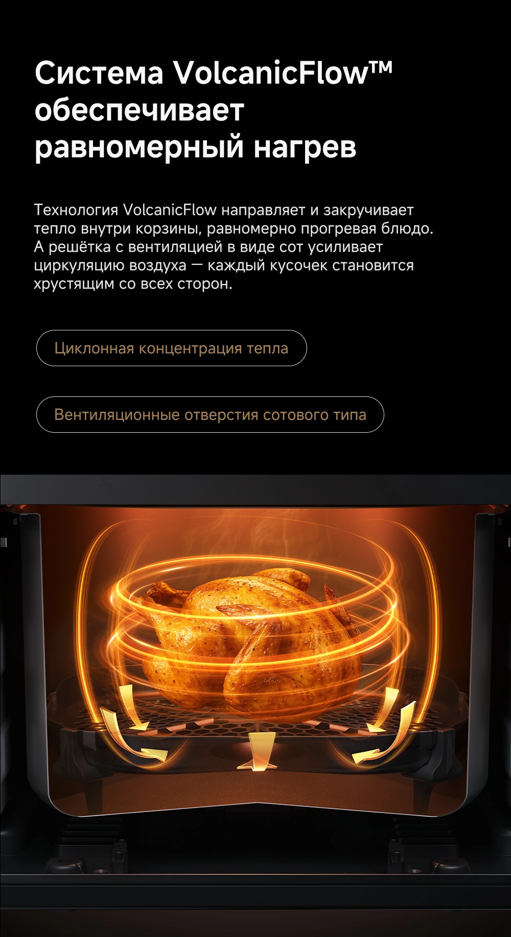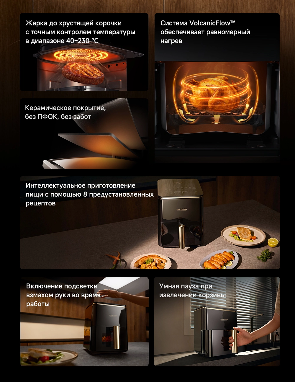 - Особенности: Технология циклонного вулканического нагрева от 40°C до 230°C. Умная пауза при извлечении корзины. 8 предустановленных рецептов. Аксессуары подходят для мытья в посудомоечной машине. Датчик, активируемый взмахом руки, включает подсветку для наблюдения за процессом готовки в реальном времени
