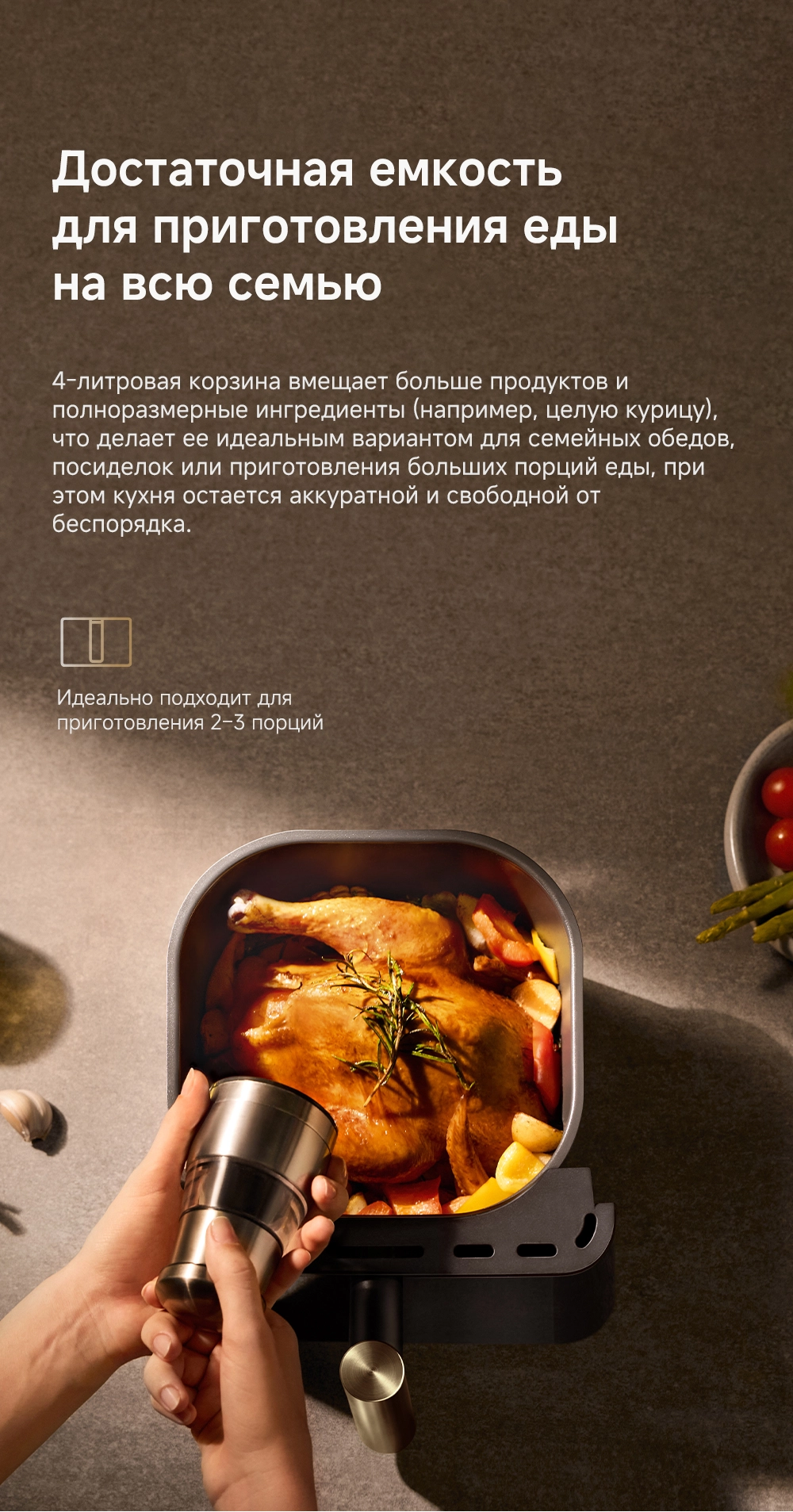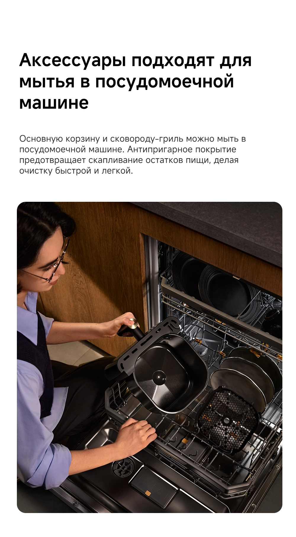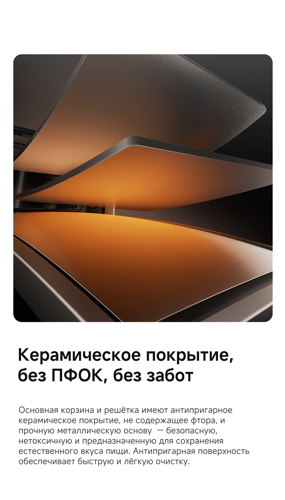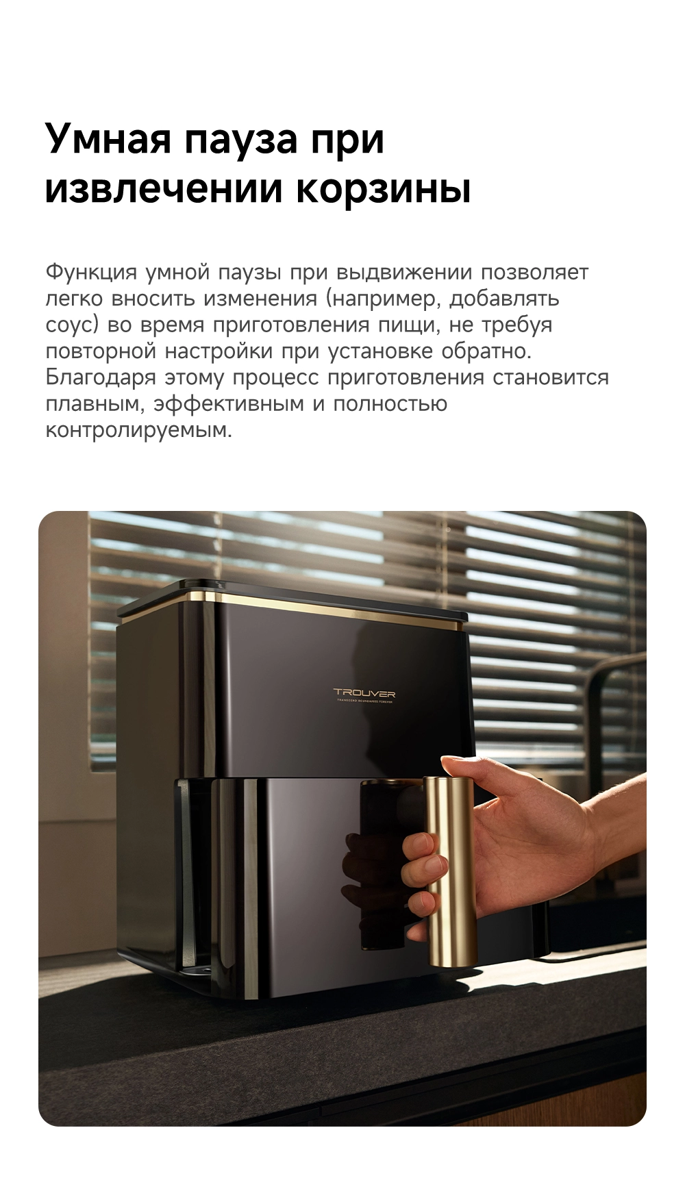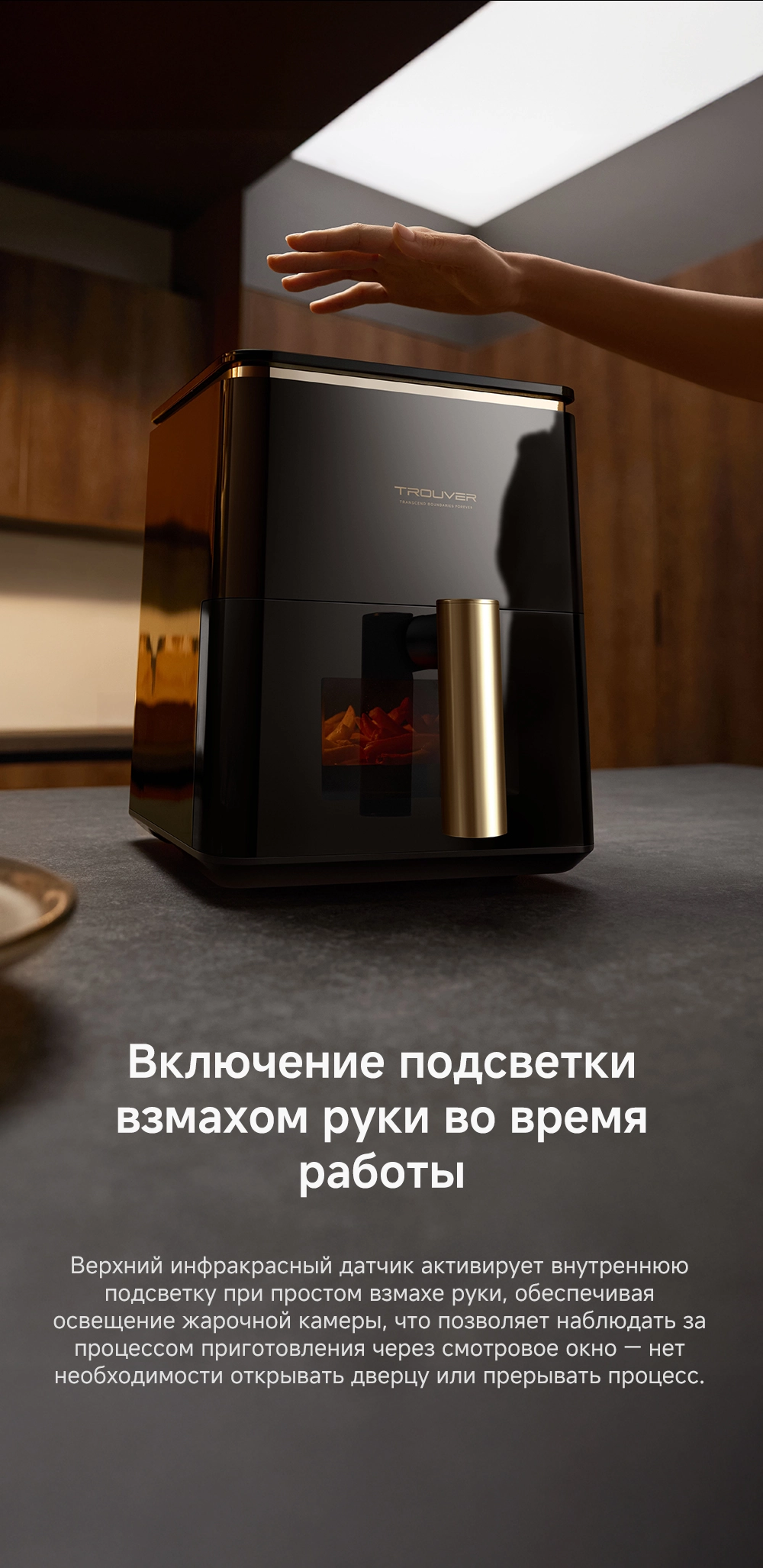 - Особенности: Технология циклонного вулканического нагрева от 40°C до 230°C. Умная пауза при извлечении корзины. 8 предустановленных рецептов. Аксессуары подходят для мытья в посудомоечной машине. Датчик, активируемый взмахом руки, включает подсветку для наблюдения за процессом готовки в реальном времени