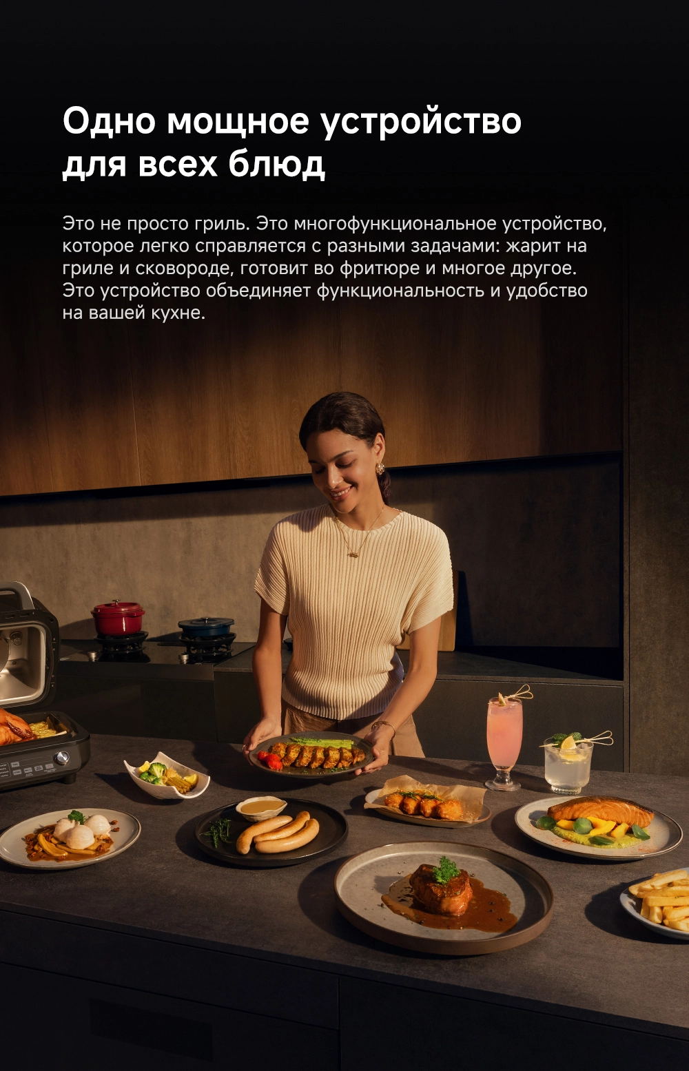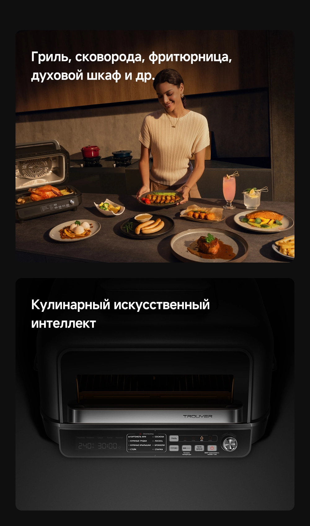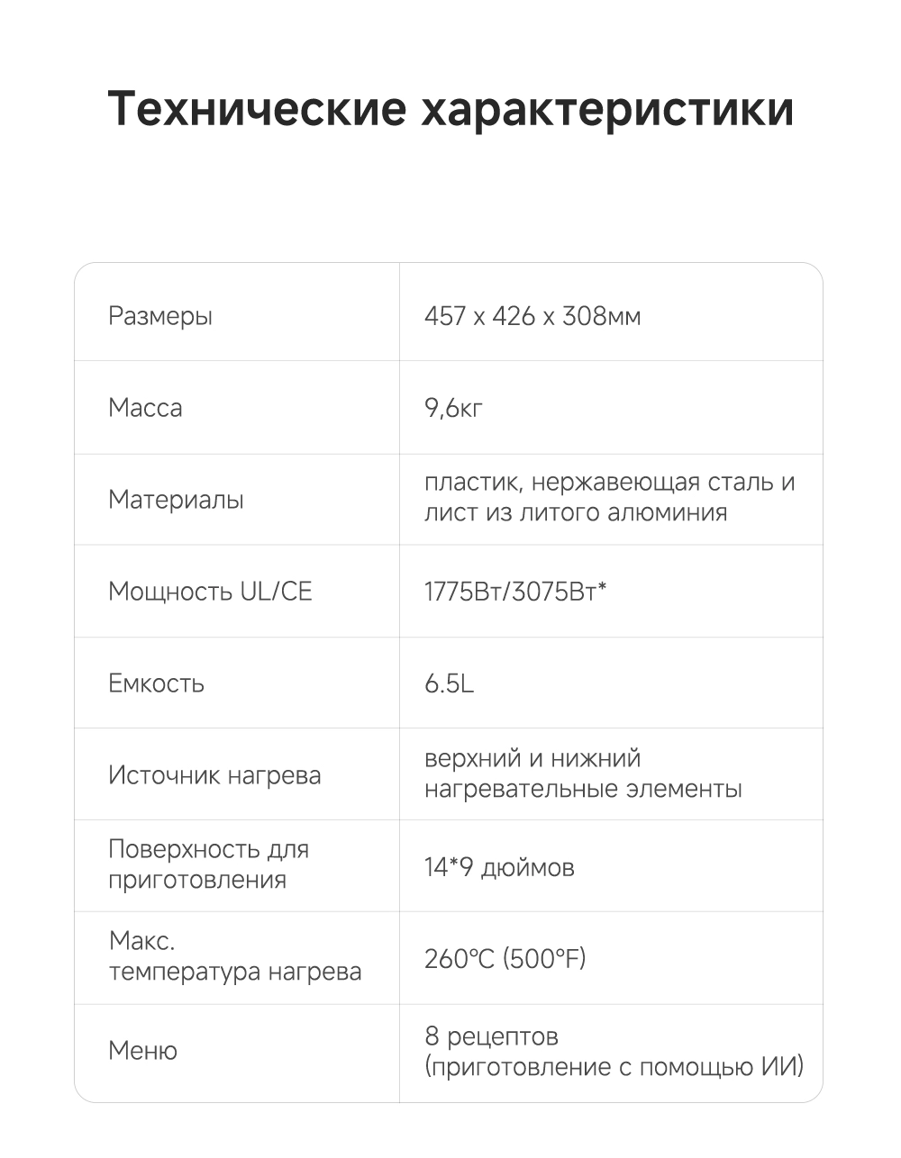 - Особенности: умный многофункциональный гриль и аэрофритюрница, мощный нагрев и точный контроль, высокоточный термометр, два датчика NTC, широкое смотровое окно, две яркие лампы по 40 Вт, большая поверхность гриля 35х23 см, литая пластина для гриля, оснащен 8 интеллектуальными режимами (основанными на искусственном интеллекте), двойные нагревательные элементы для объемного воздействия тепла - циркуляция горячего воздуха на 360, максимальная температура для нагрева 260С, емкость 6.5 л, профессиональная кулинария с пошаговыми рецептами, очистка без забот - все аксессуары имеют антипригарное покрытие без ПТФЭ/ПФОК и пригодны для мытья в посудомоечной машине, источник нагрева - верхний и нижний нагревательные элементы