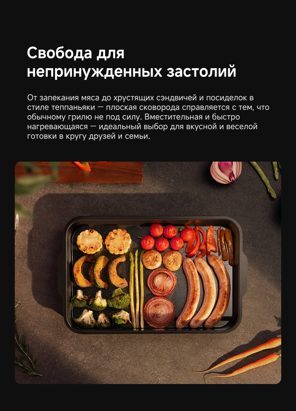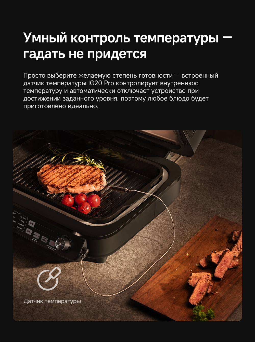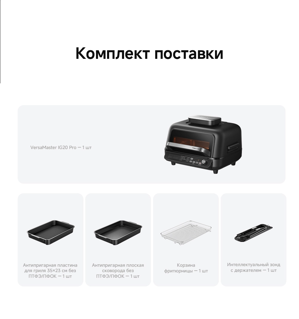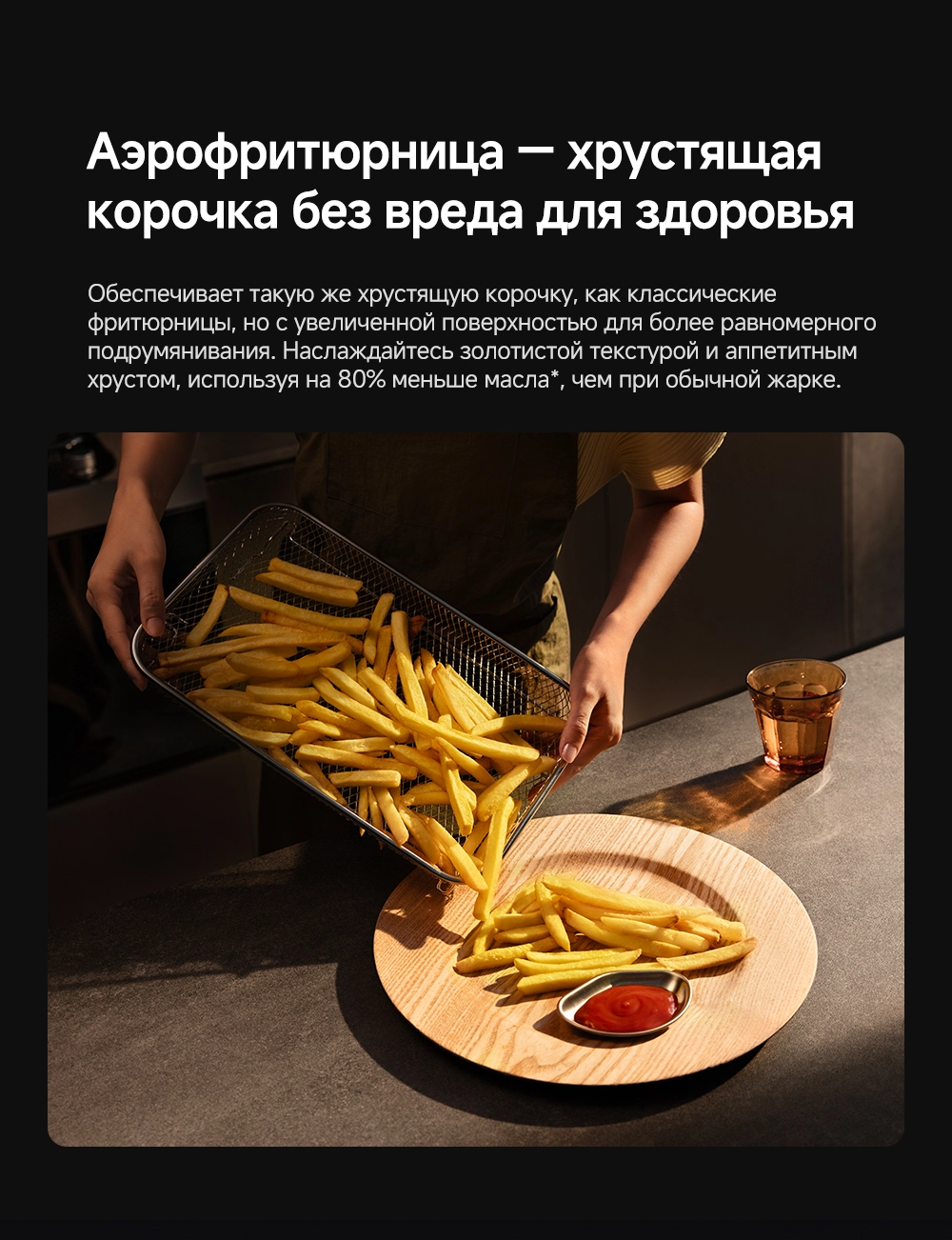 - Особенности: умный многофункциональный гриль и аэрофритюрница, мощный нагрев и точный контроль, высокоточный термометр, два датчика NTC, широкое смотровое окно, две яркие лампы по 40 Вт, большая поверхность гриля 35х23 см, литая пластина для гриля, оснащен 8 интеллектуальными режимами (основанными на искусственном интеллекте), двойные нагревательные элементы для объемного воздействия тепла - циркуляция горячего воздуха на 360, максимальная температура для нагрева 260С, емкость 6.5 л, профессиональная кулинария с пошаговыми рецептами, очистка без забот - все аксессуары имеют антипригарное покрытие без ПТФЭ/ПФОК и пригодны для мытья в посудомоечной машине, источник нагрева - верхний и нижний нагревательные элементы