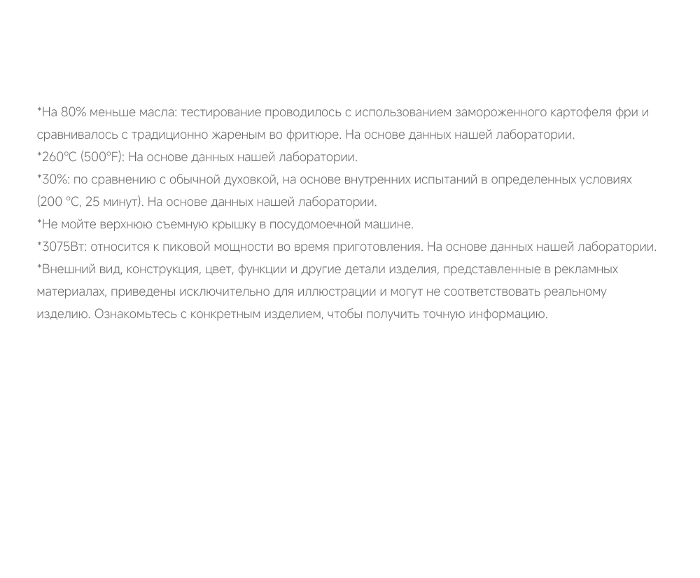 - Список режимов/программ приготовления: брокколи, картофель фри, куриная грудка, куриные крылышки, лосось, сосиски, спаржа, стейк