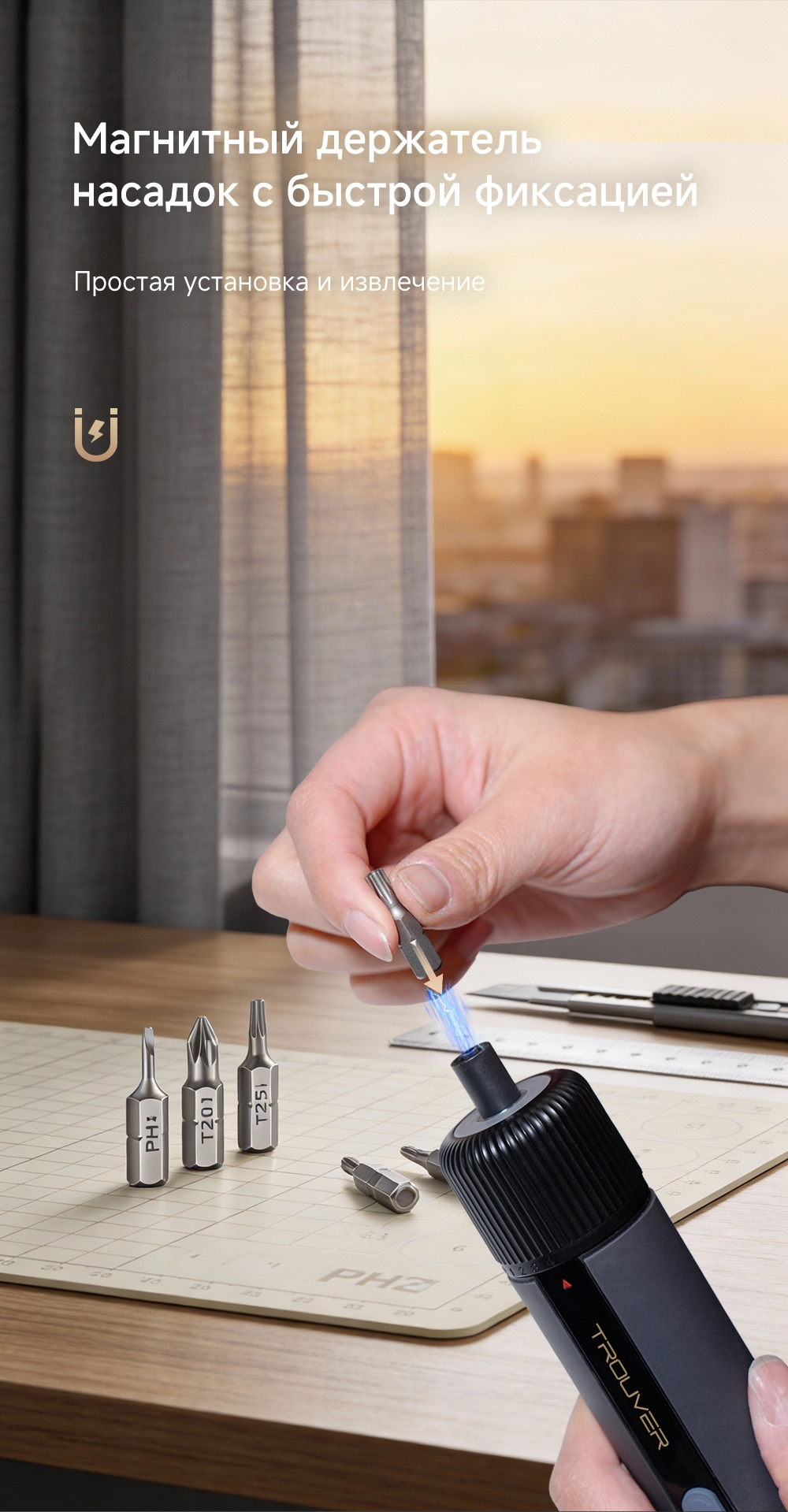 - Описание: быстросъёмные магнитные насадки. Мгновенная остановка при достижении заданного крутящего момента