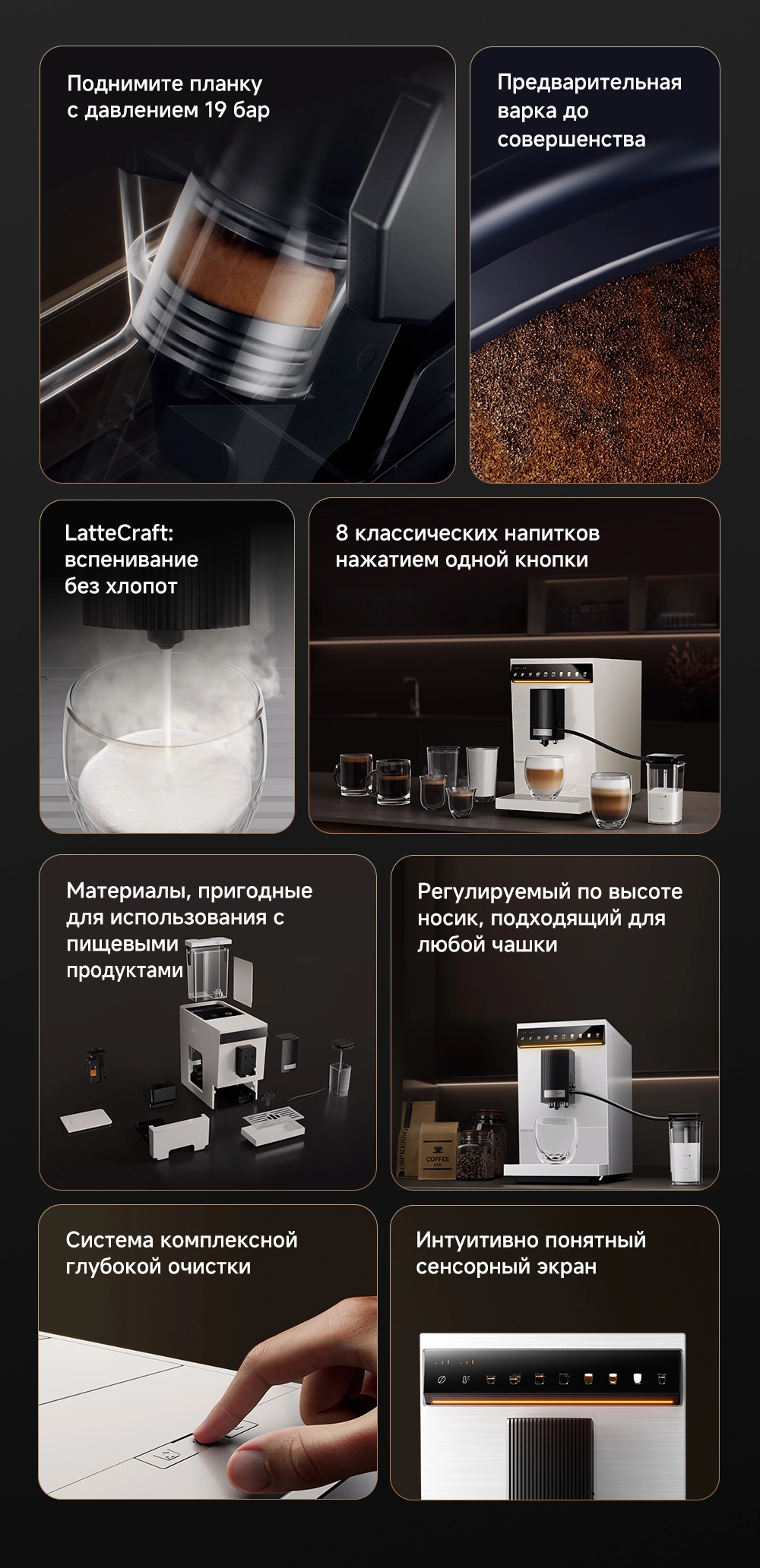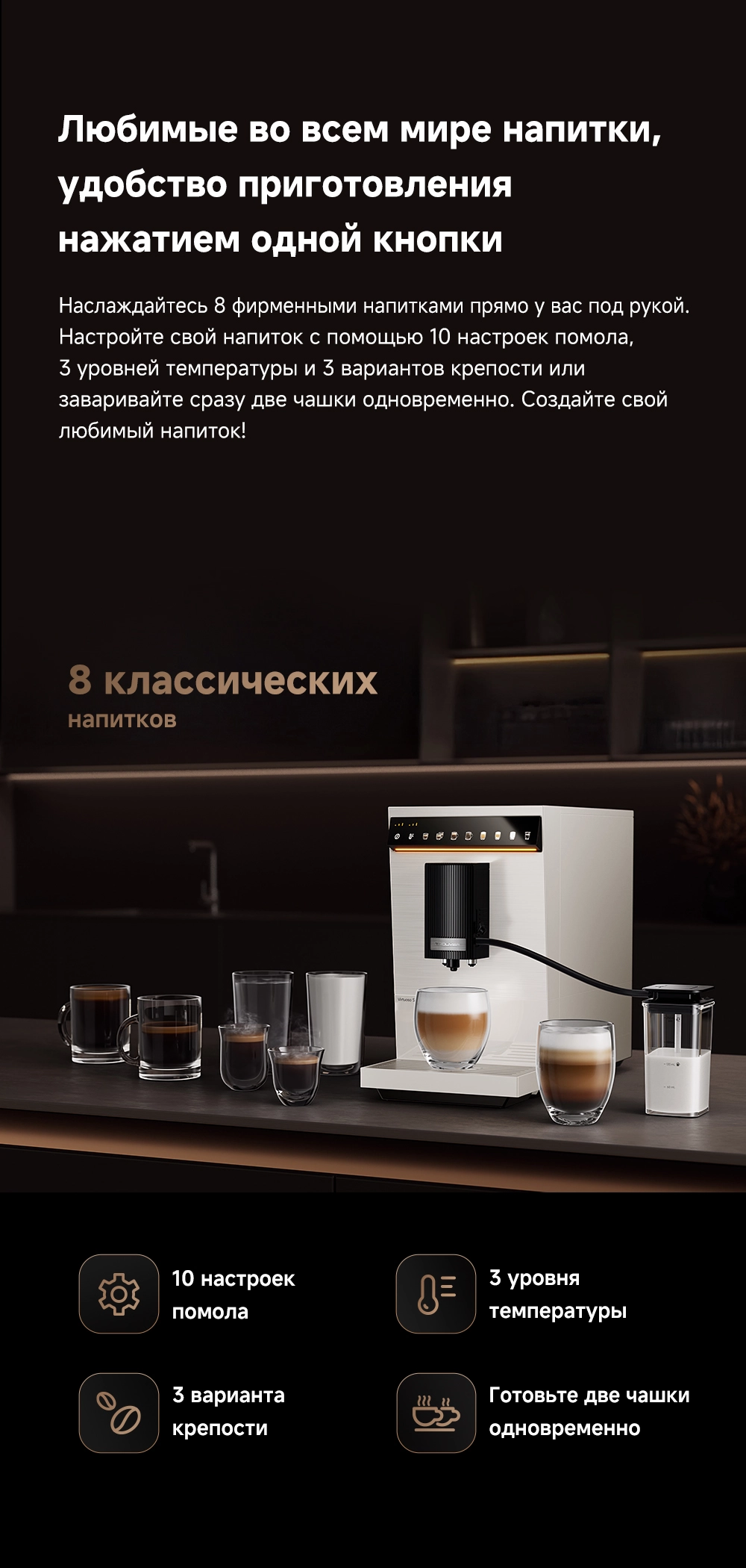 - Особенности: светодиодный цветной сенсорный интерфейс. Система вспенивания молока LatteArtisan - приготовление кофе с молоком всего одним нажатием. Индивидуальные напитки: 8 вариантов меню, 3 уровня регулировки температуры, 3 уровня выбора крепости, 10 уровней настройки помола, приготовление 2 чашек за раз