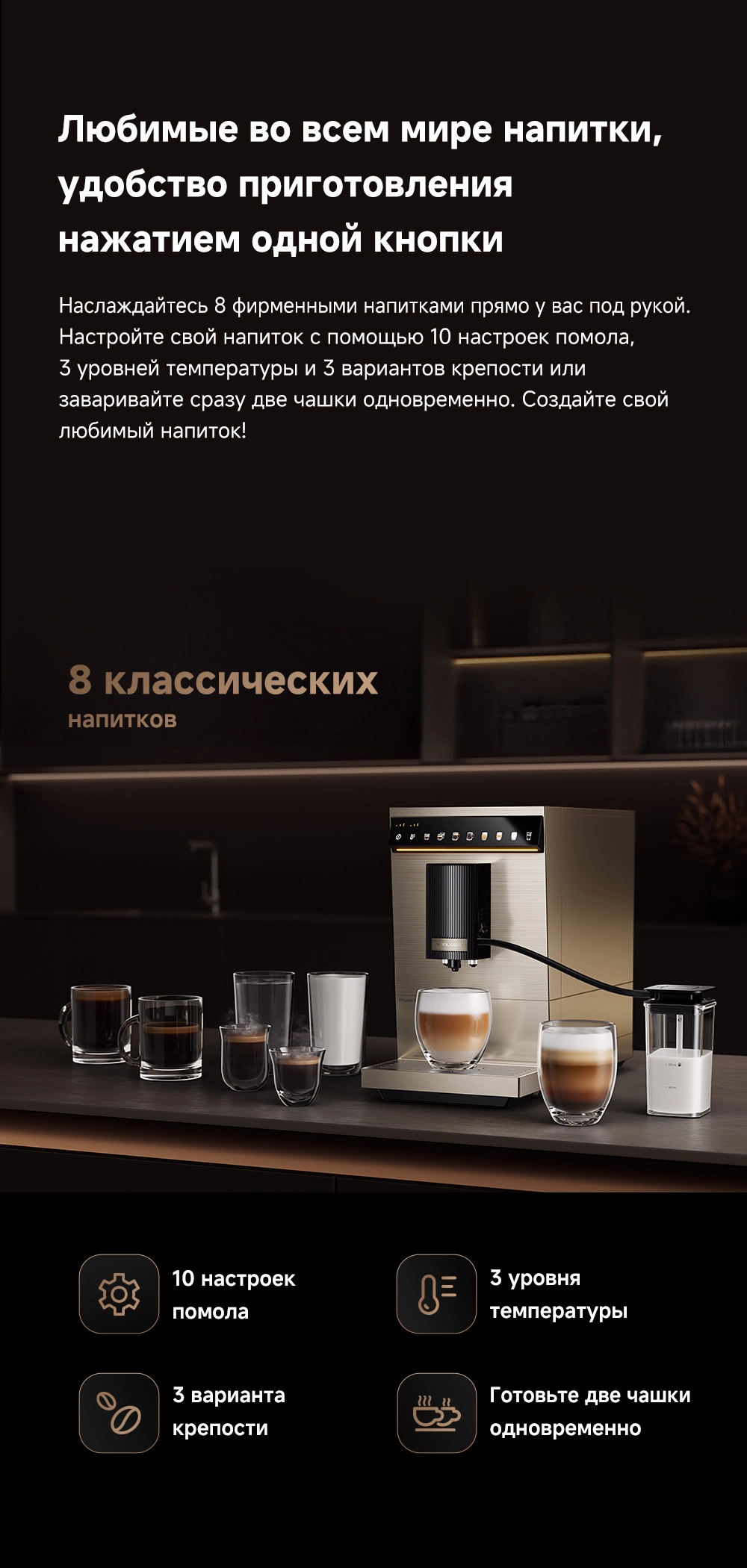 - Особенности: светодиодный цветной сенсорный интерфейс. Система вспенивания молока LatteArtisan - приготовление кофе с молоком всего одним нажатием. Индивидуальные напитки: 8 вариантов меню, 3 уровня регулировки температуры, 3 уровня выбора крепости, 10 уровней настройки помола, приготовление 2 чашек за раз