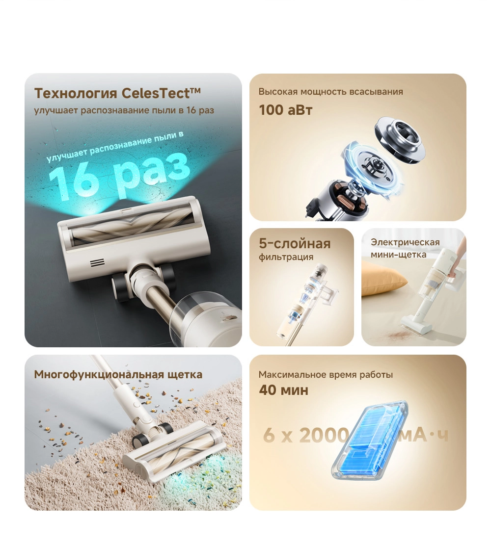 - Особенности: технология CelesTect, высокая мощность всасывания 100 аВт, рабочая мощность 310 Вт, давление всасывания 19 кПа, 5-слойная система фильтрации, электрическая мини-щетка, многофункциональная щетка, время работы до 40 мин, ёмкость аккумулятора 6х2000 мАч, продолжительность зарядки 4.5 ч, настенное хранение, переключение одним нажатием, ёмкость пылесборника 0.35 л