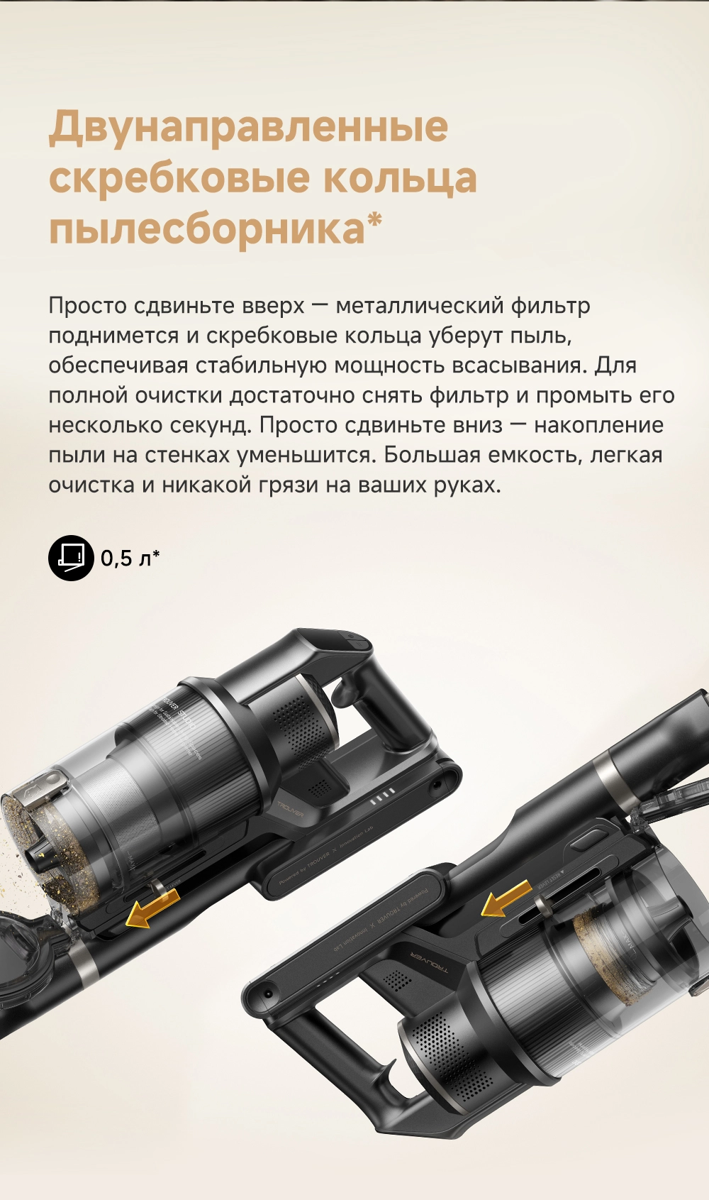 - Описание: первый беспроводной вертикальный пылесос Trouver с роботизированной ручкой, которая обеспечивает уборку вдоль краёв без зазоров. Технология OptiInsight выявляет скрытые загрязнения, а резиновые волоски на ролике препятствуют спутыванию волос. Быстрый и гигиеничный процесс очистки пылесборника. Автоматическая регулировка мощности всасывания в зависимости от интенсивности загрязнения