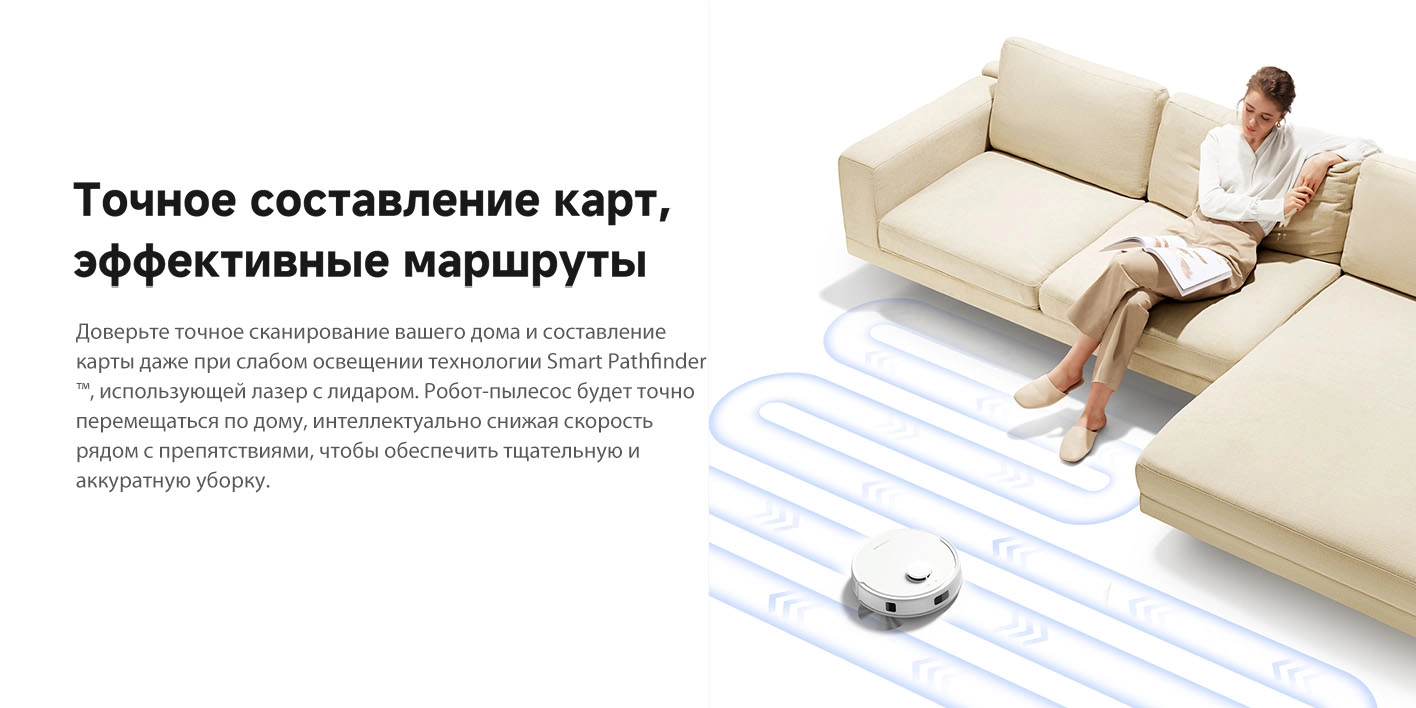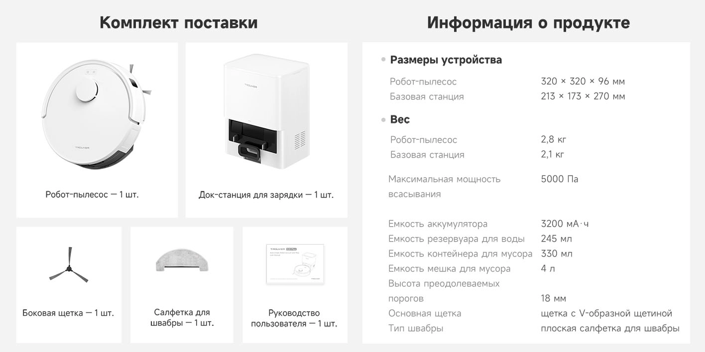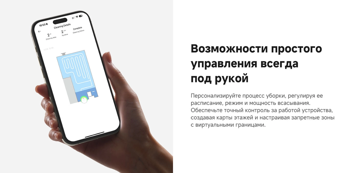 - Функциональные особенности пылесоса: локальная уборка, уборка по расписанию, виртуальная стена в приложении, автовозврат на базу, определение ковров