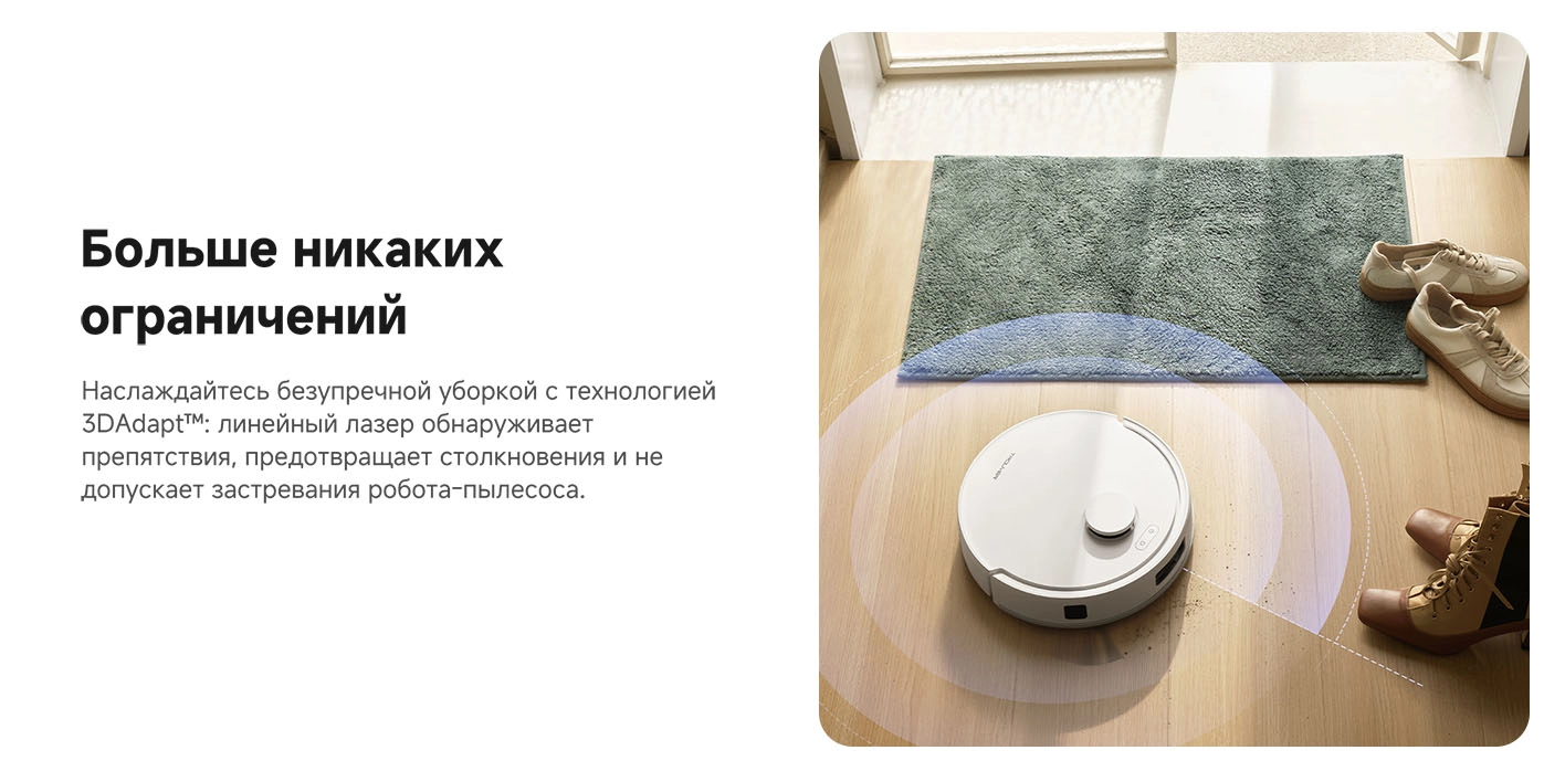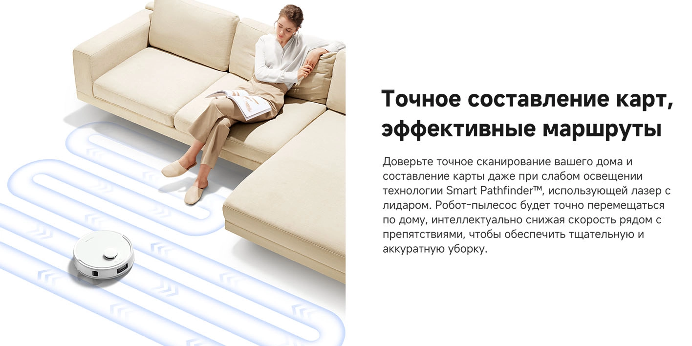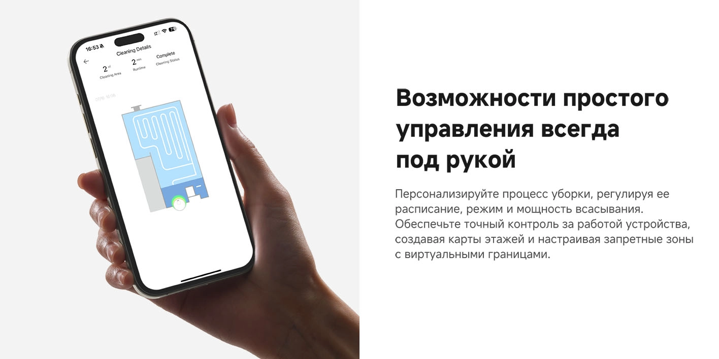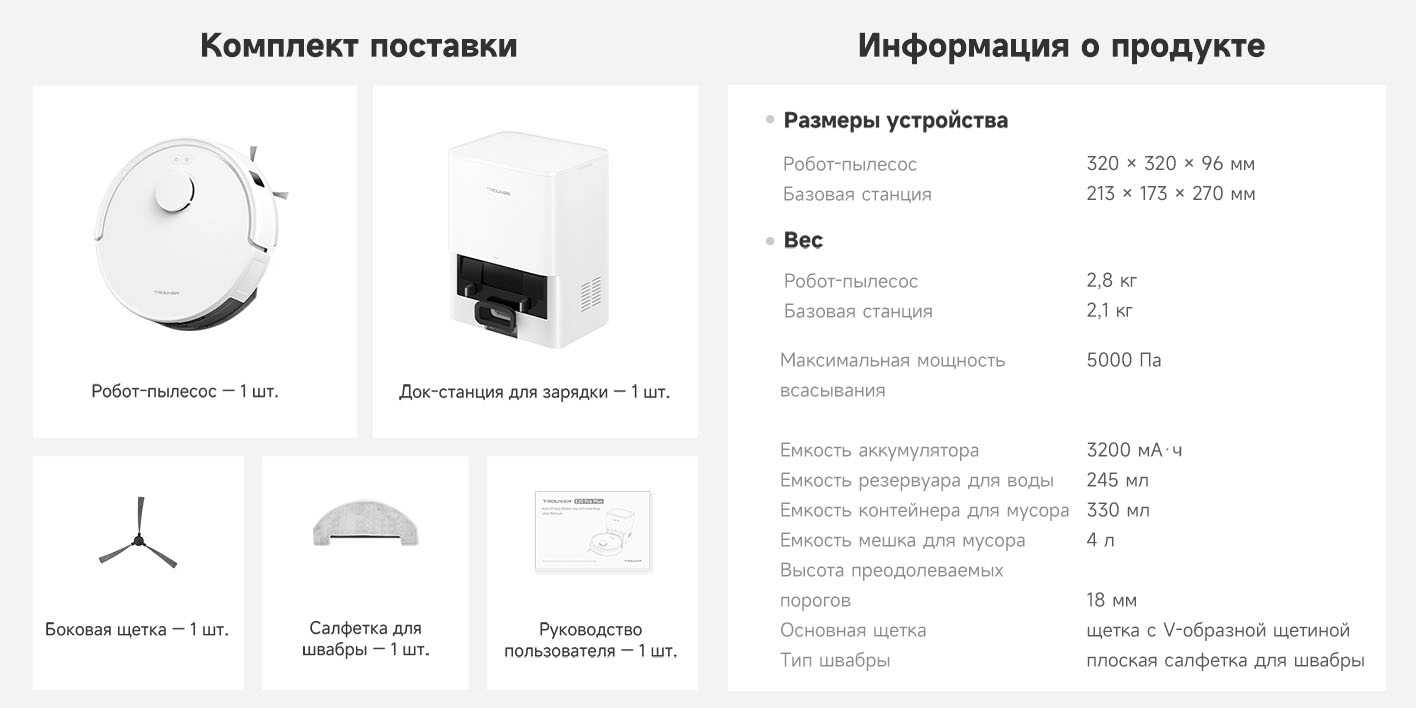 - Функциональные особенности пылесоса: локальная уборка, уборка по расписанию, виртуальная стена в приложении, автовозврат на базу, определение ковров