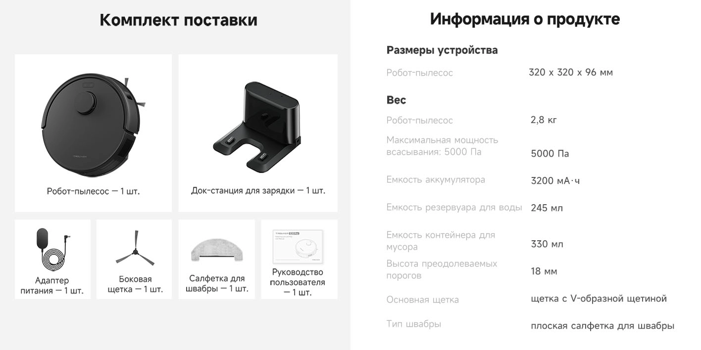 - Функциональные особенности пылесоса: локальная уборка, уборка по расписанию, виртуальная стена в приложении, автовозврат на базу, определение ковров