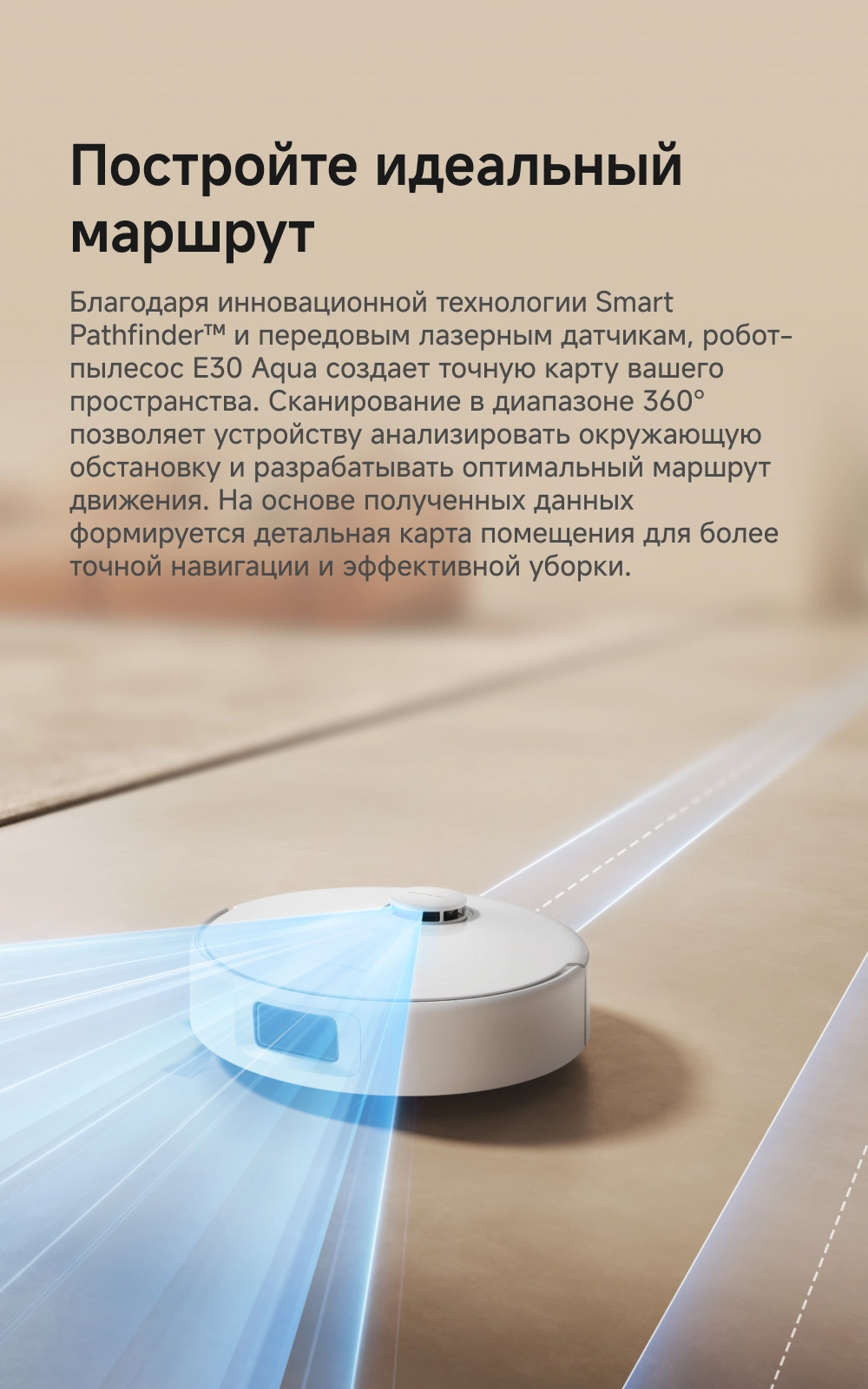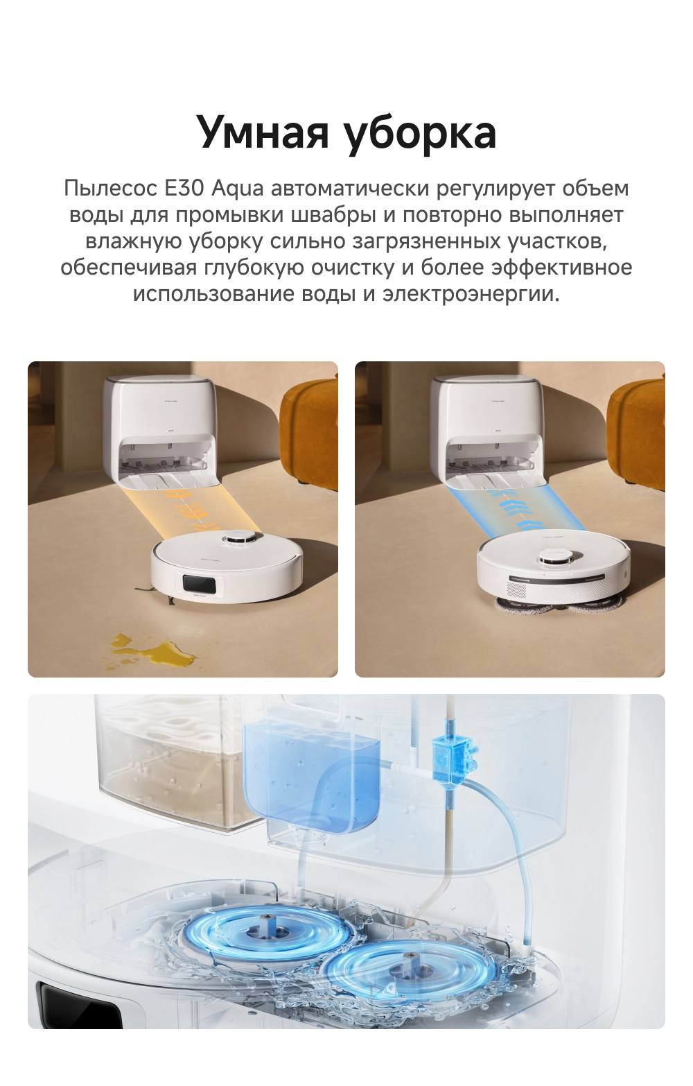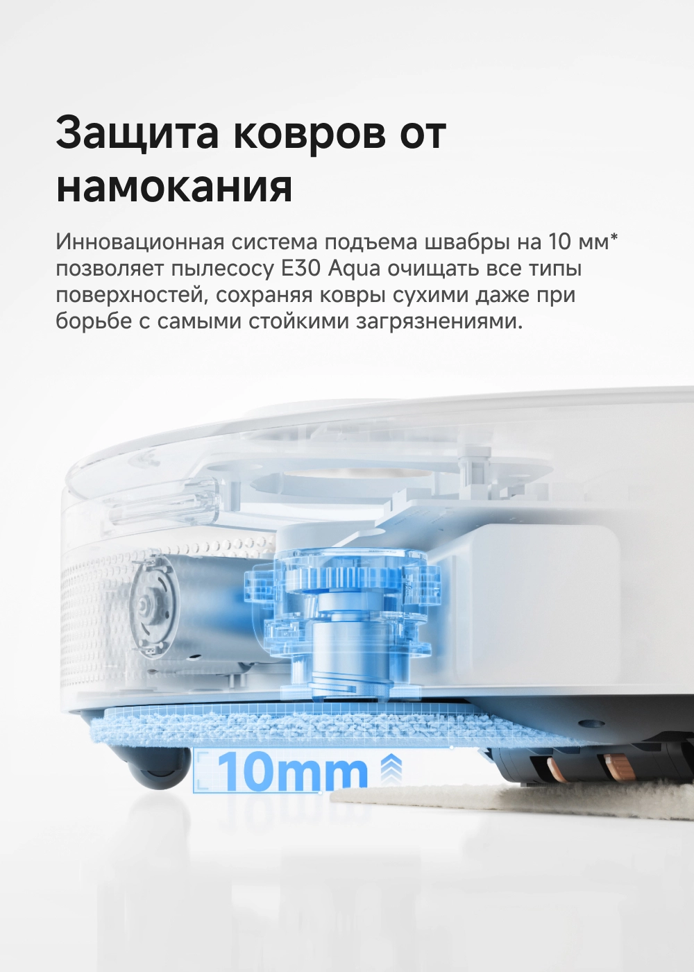 - Особенности: высокая мощность всасывания - 10 000 Па. Интеллектуальный подъем швабр и интеллектуальная стратегия очистки ковровых покрытий. Автоматическое дозирование моющего средства и промывка швабр. Большой одноразовый пылесборник объемом 1л. Сушка швабр горячим воздухом. Робот-пылесос E30 Aqua распознает и объезжает более 70 типов препятствий, таких как обувь и провода, обеспечивая бесперебойную уборку
