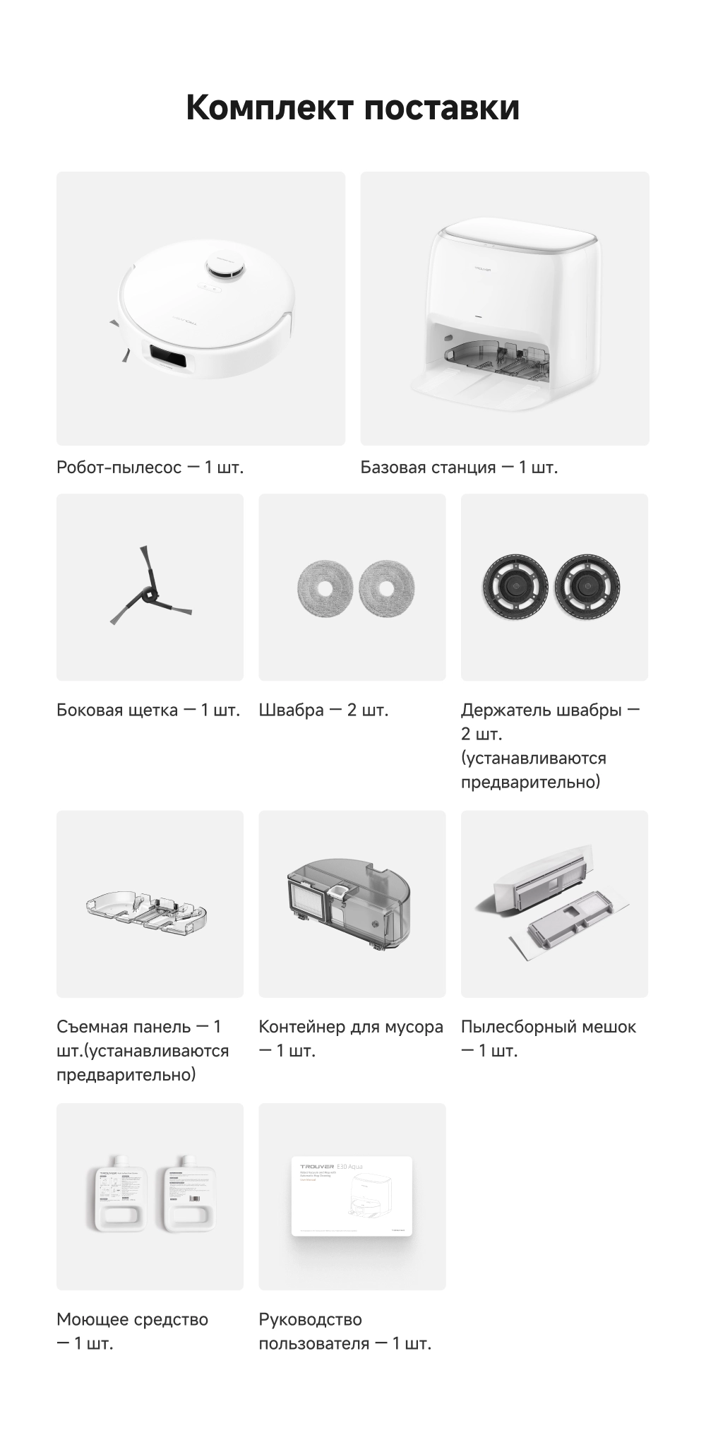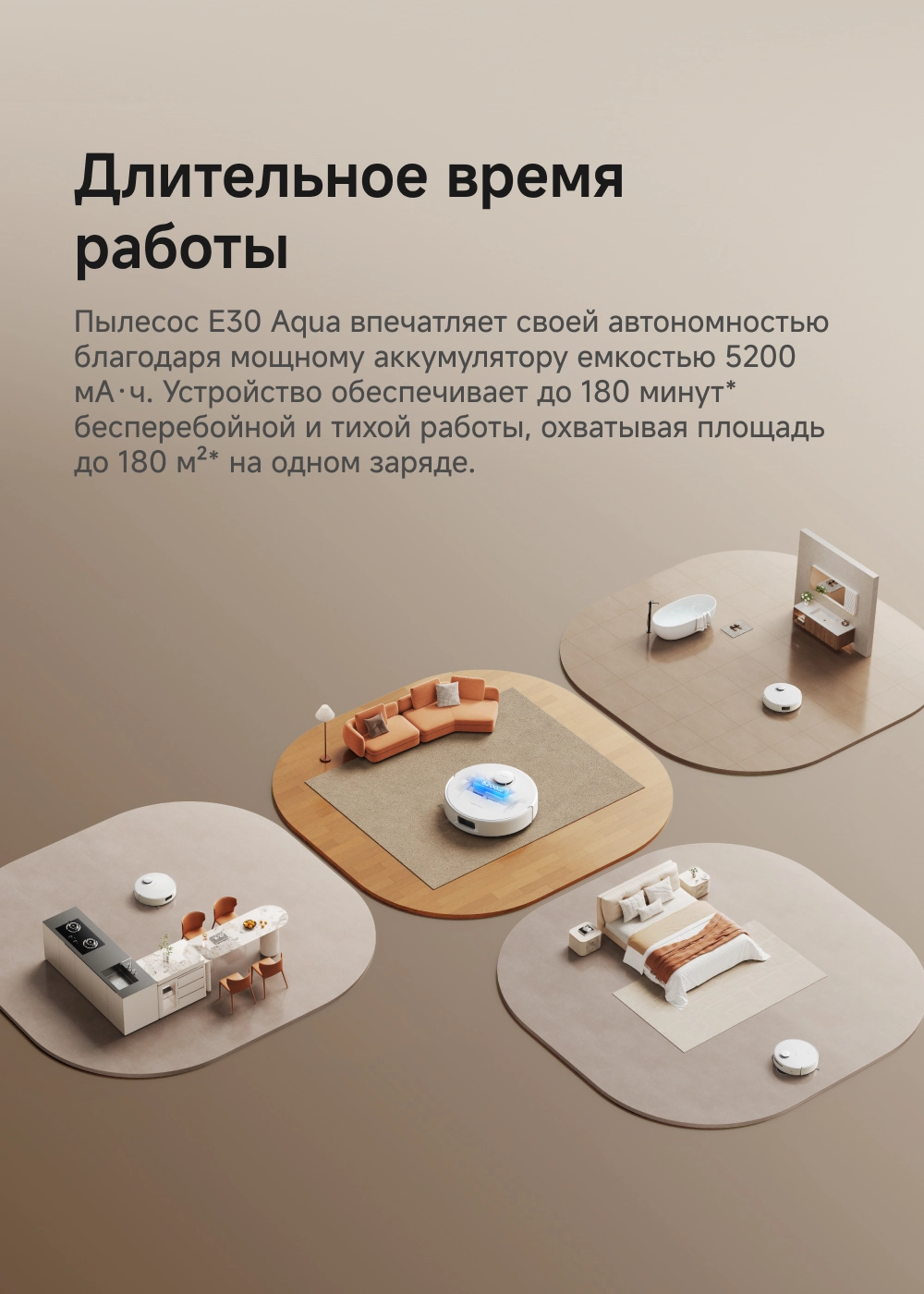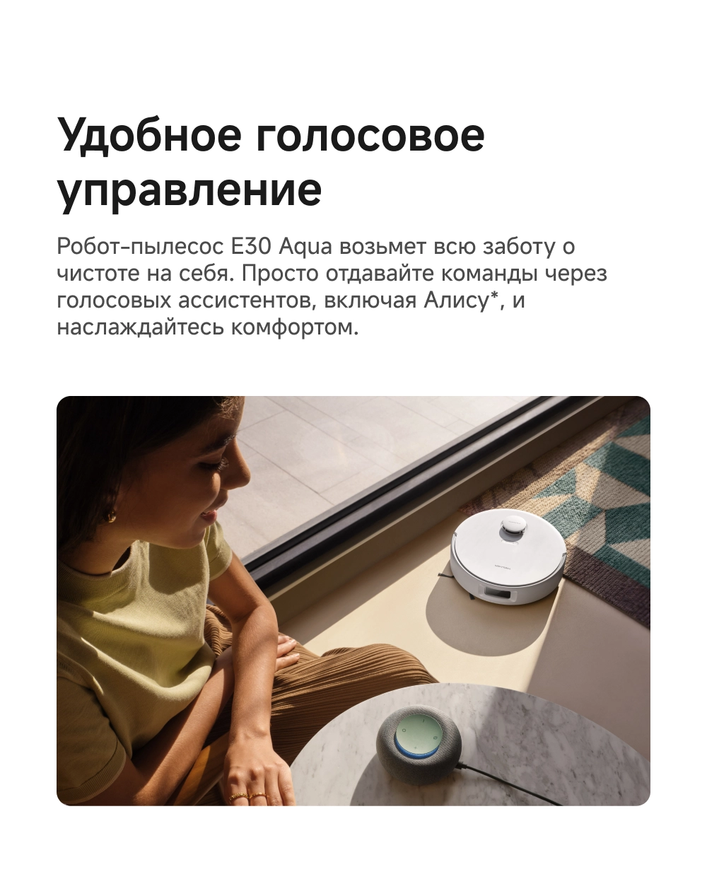 - Особенности: высокая мощность всасывания - 10 000 Па. Интеллектуальный подъем швабр и интеллектуальная стратегия очистки ковровых покрытий. Автоматическое дозирование моющего средства и промывка швабр. Большой одноразовый пылесборник объемом 1л. Сушка швабр горячим воздухом. Робот-пылесос E30 Aqua распознает и объезжает более 70 типов препятствий, таких как обувь и провода, обеспечивая бесперебойную уборку