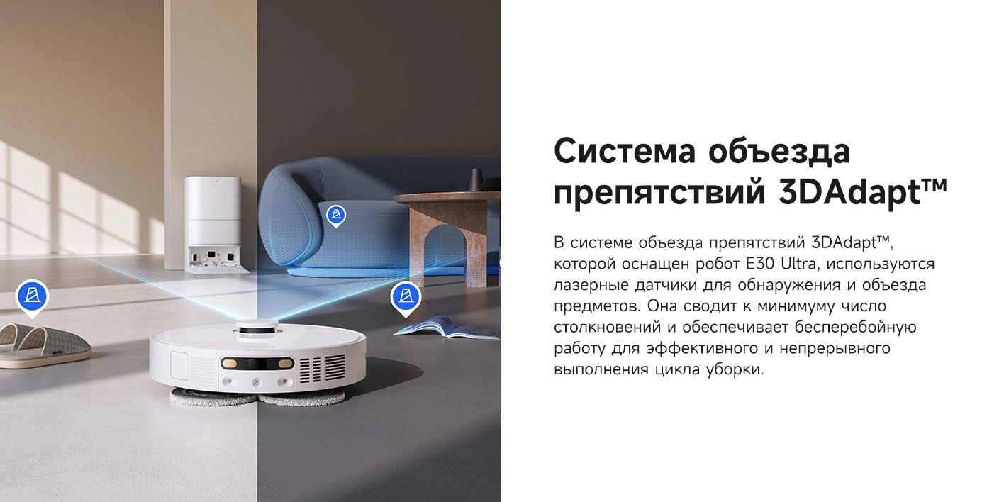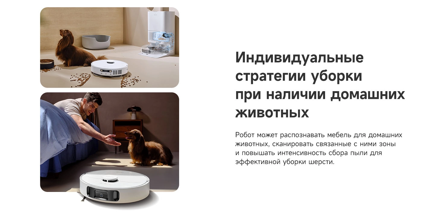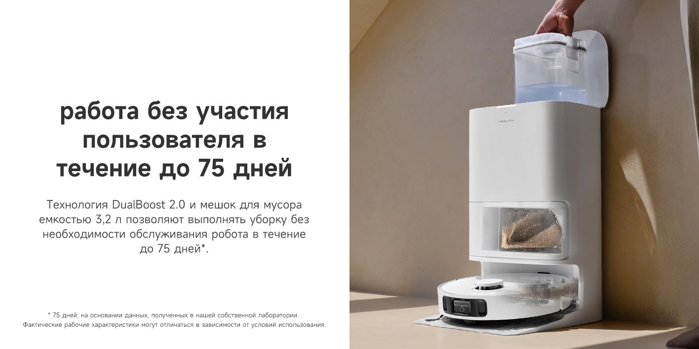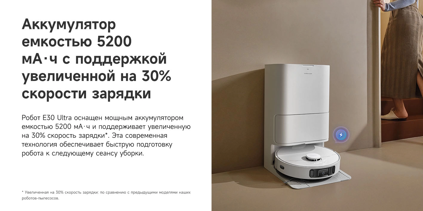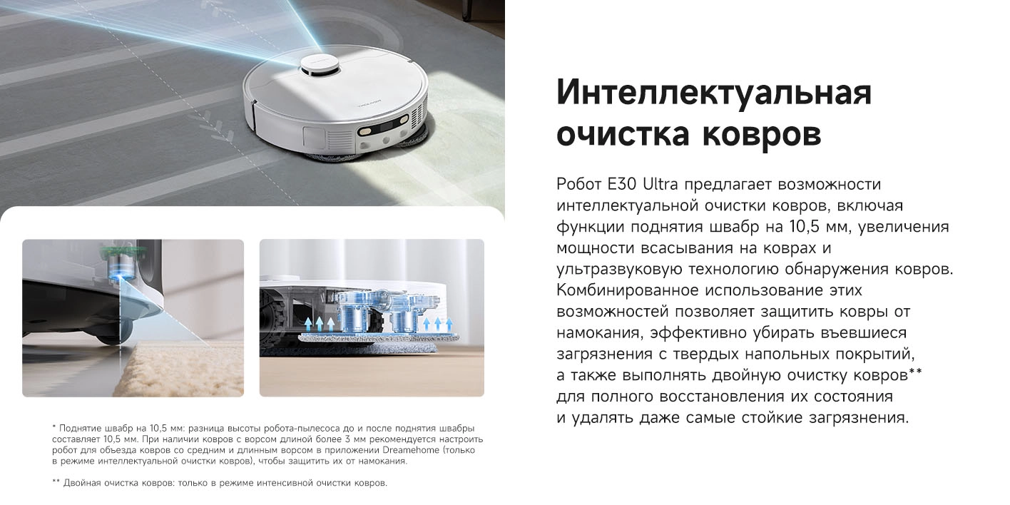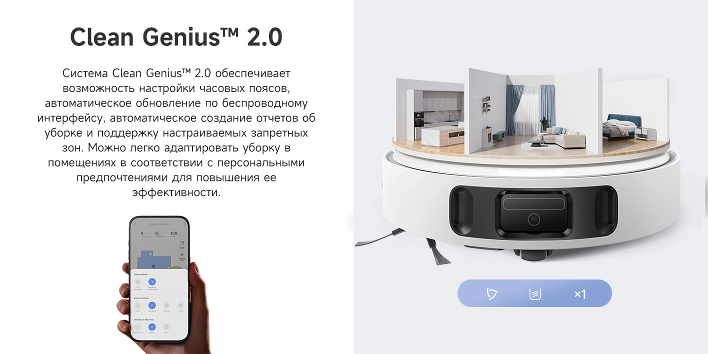 - Функциональные особенности пылесоса: локальная уборка, уборка по расписанию, виртуальная стена в приложении, автовозврат на базу, определение ковров, выдвигающаяся насадка для влажной уборки, подъем тряпки на ковре