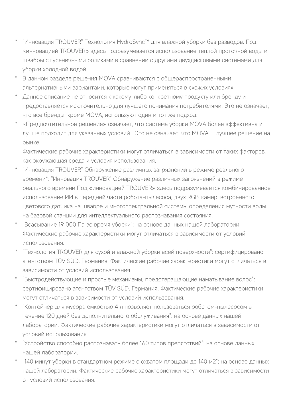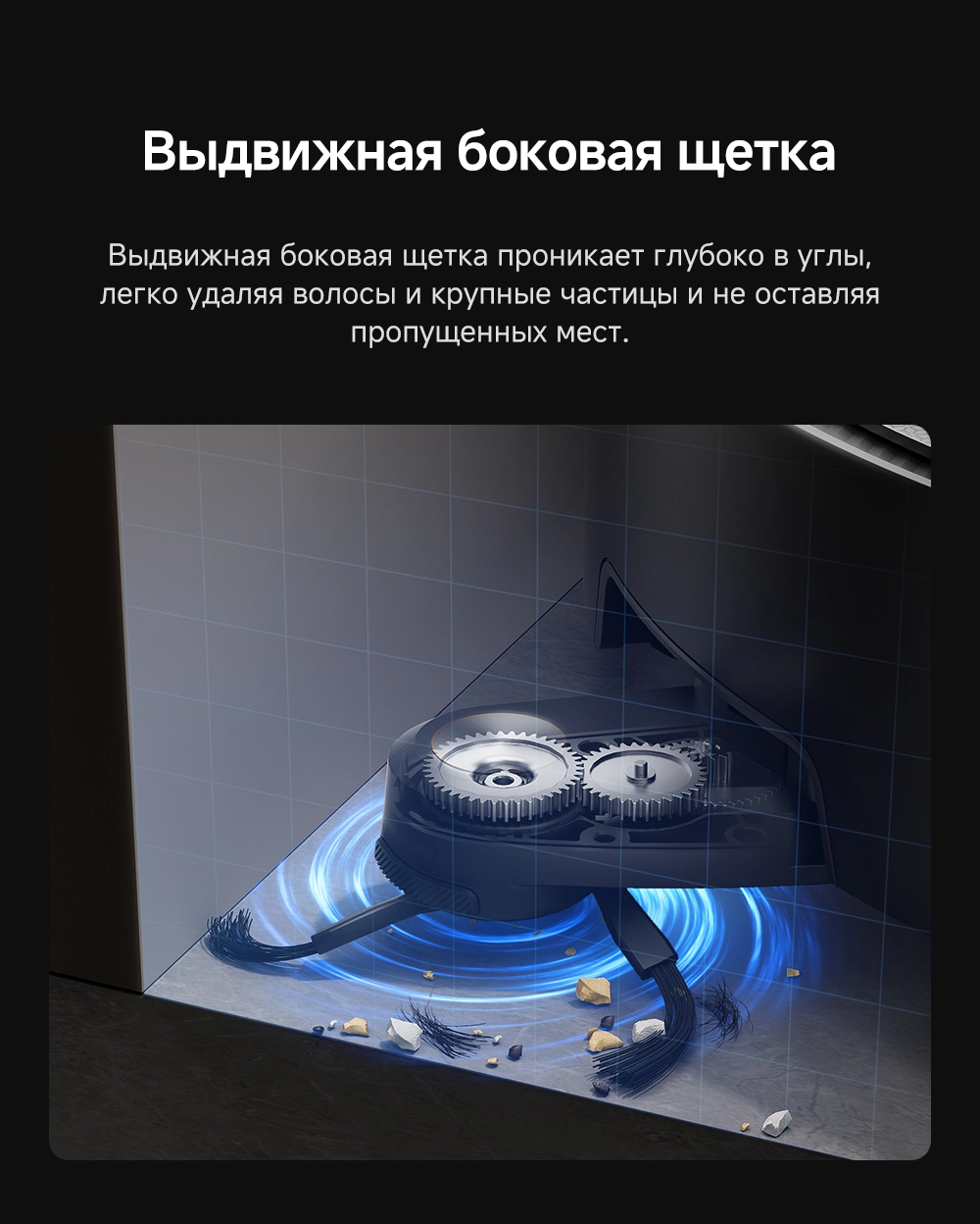 - Функциональные особенности пылесоса: локальная уборка, уборка по расписанию, виртуальная стена в приложении, автовозврат на базу, определение ковров, выдвигающаяся боковая щетка, вспомогательная боковая швабра, подъем тряпки на ковре, подъем боковой щетки, подъем турбощетки, датчик загрязнения