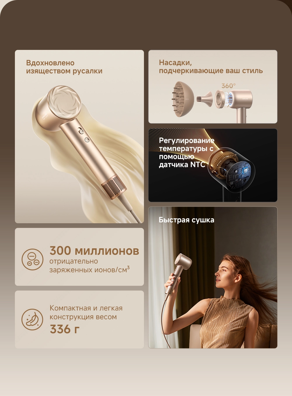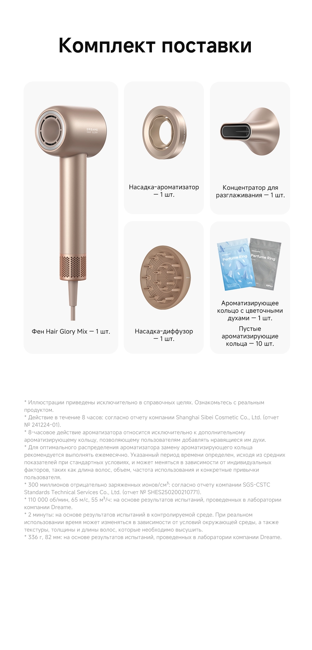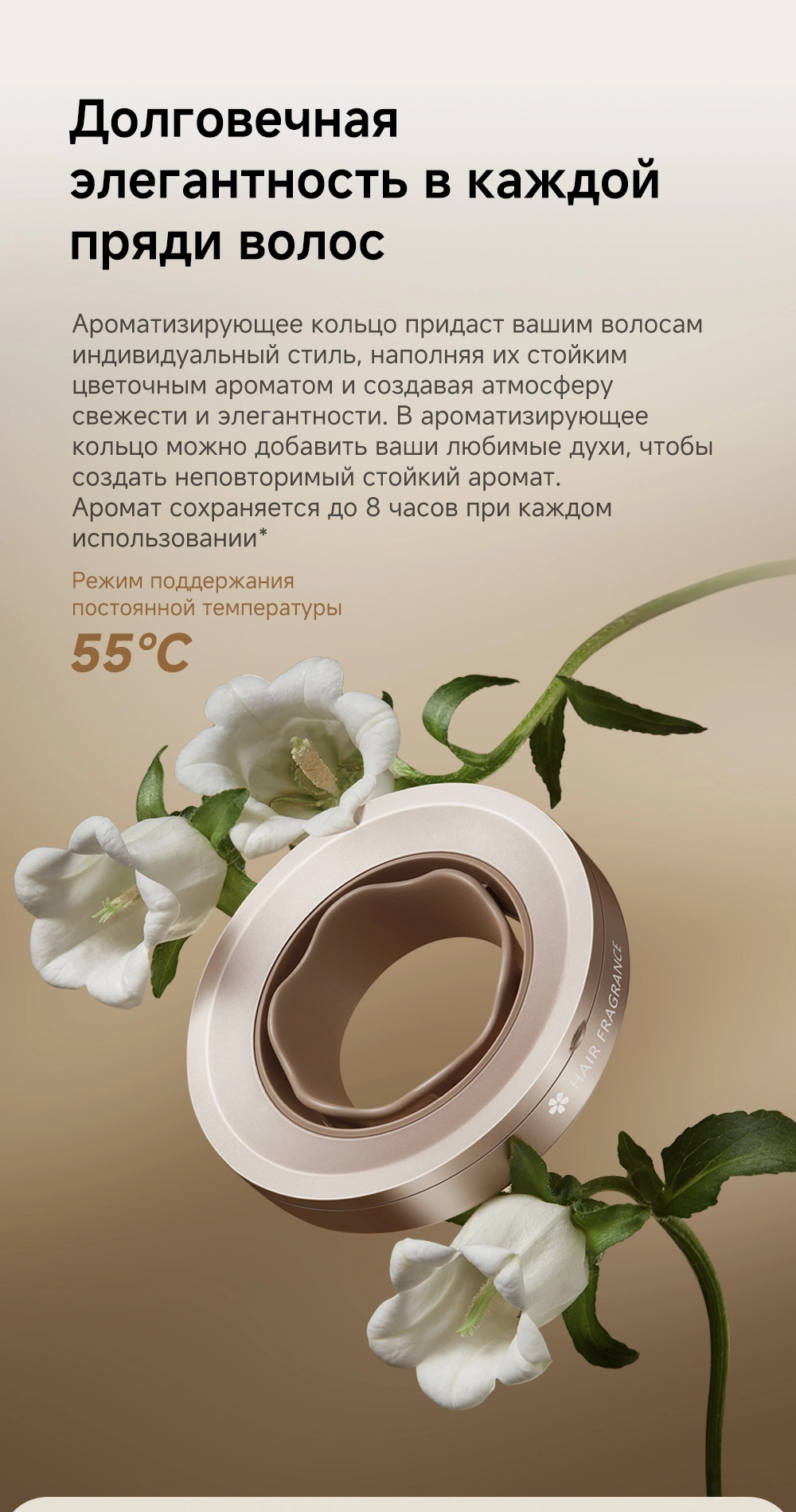 - Особенности: датчик NTC контролирует и регулирует нагрев, выполняя 300 проверок в секунду, насадка-ароматизатор мягко рассеивает поток насыщенного парфюмом воздуха, питая волосы, оставляя их гладкими и наполненными ароматом парфюма, высокая концентрация отрицательно заряженных ионов мгновенно нейтрализует статический заряд, разглаживая волосы