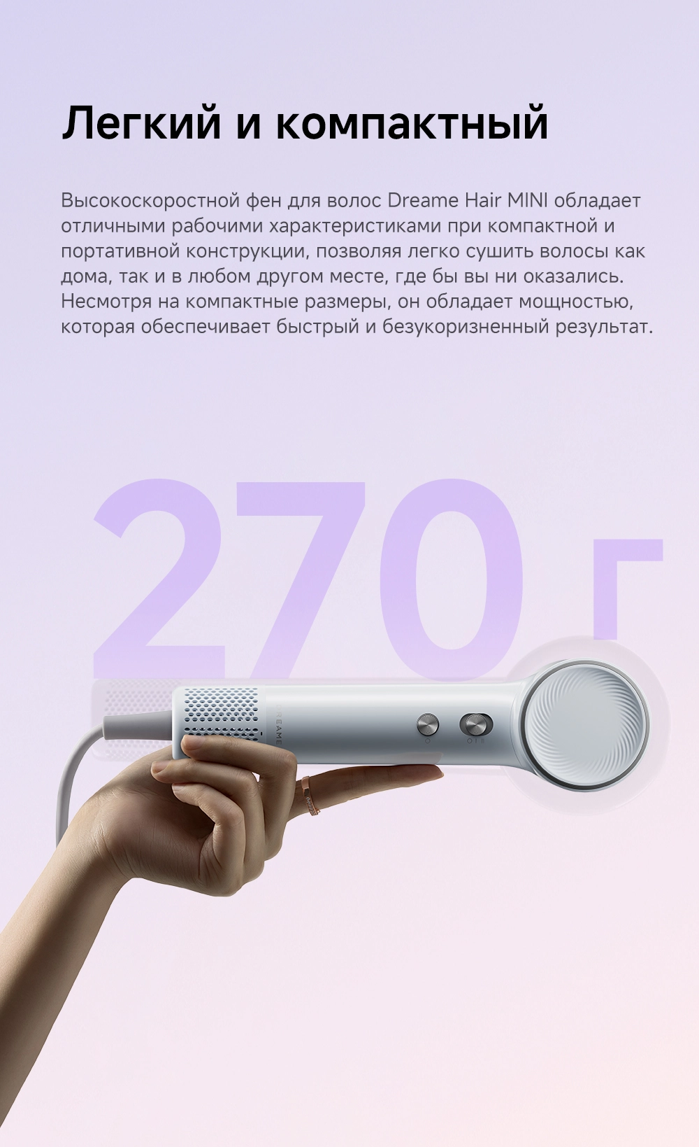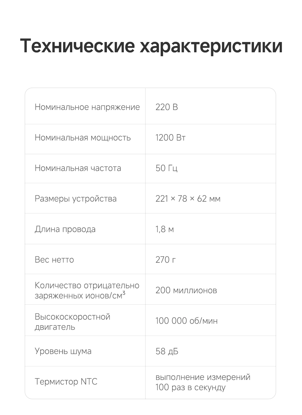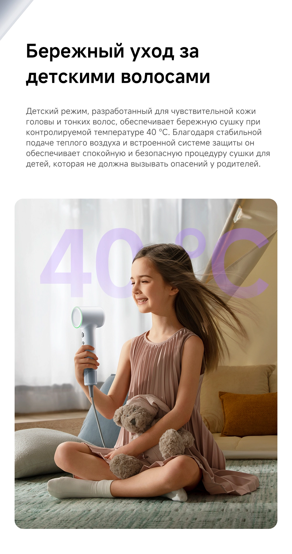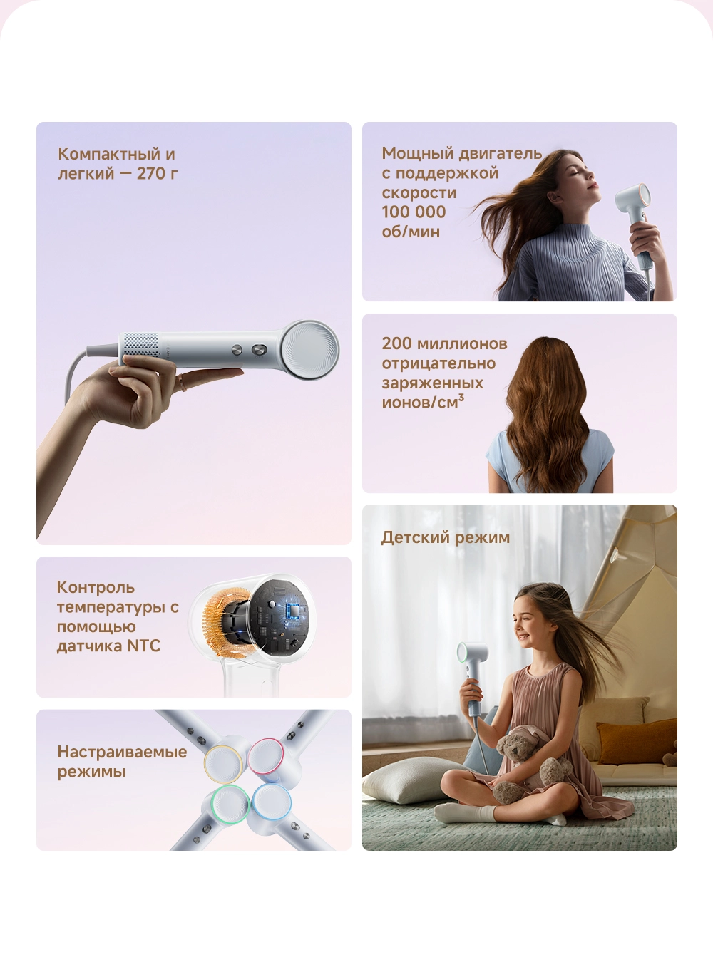 - Особенности: мощный воздушный поток, лёгкий вес, всего 270 грамм, компактный размер, высокая концентрация отрицательно заряженных ионов эффективно нейтрализует статическое электричество, разглаживая волосы, детский режим, разработанный для чувствительной кожи головы и тонких волос, обеспечивает мягкую сушку при контролируемой температуре 40°С