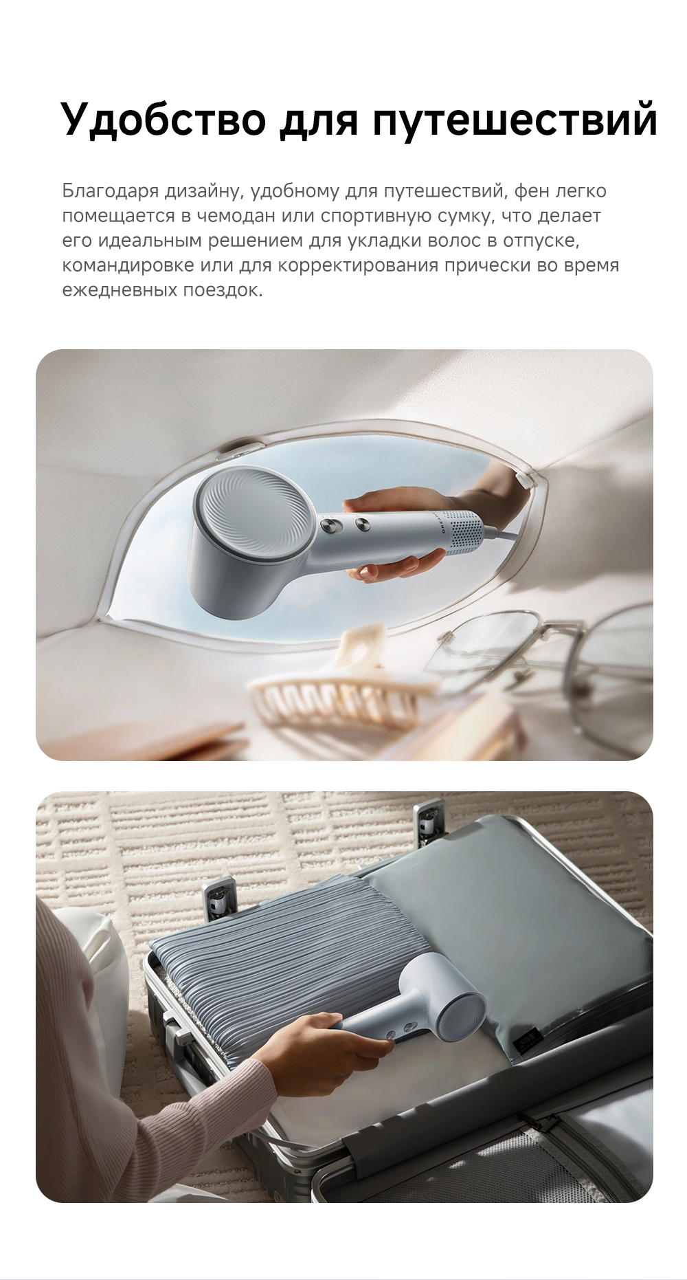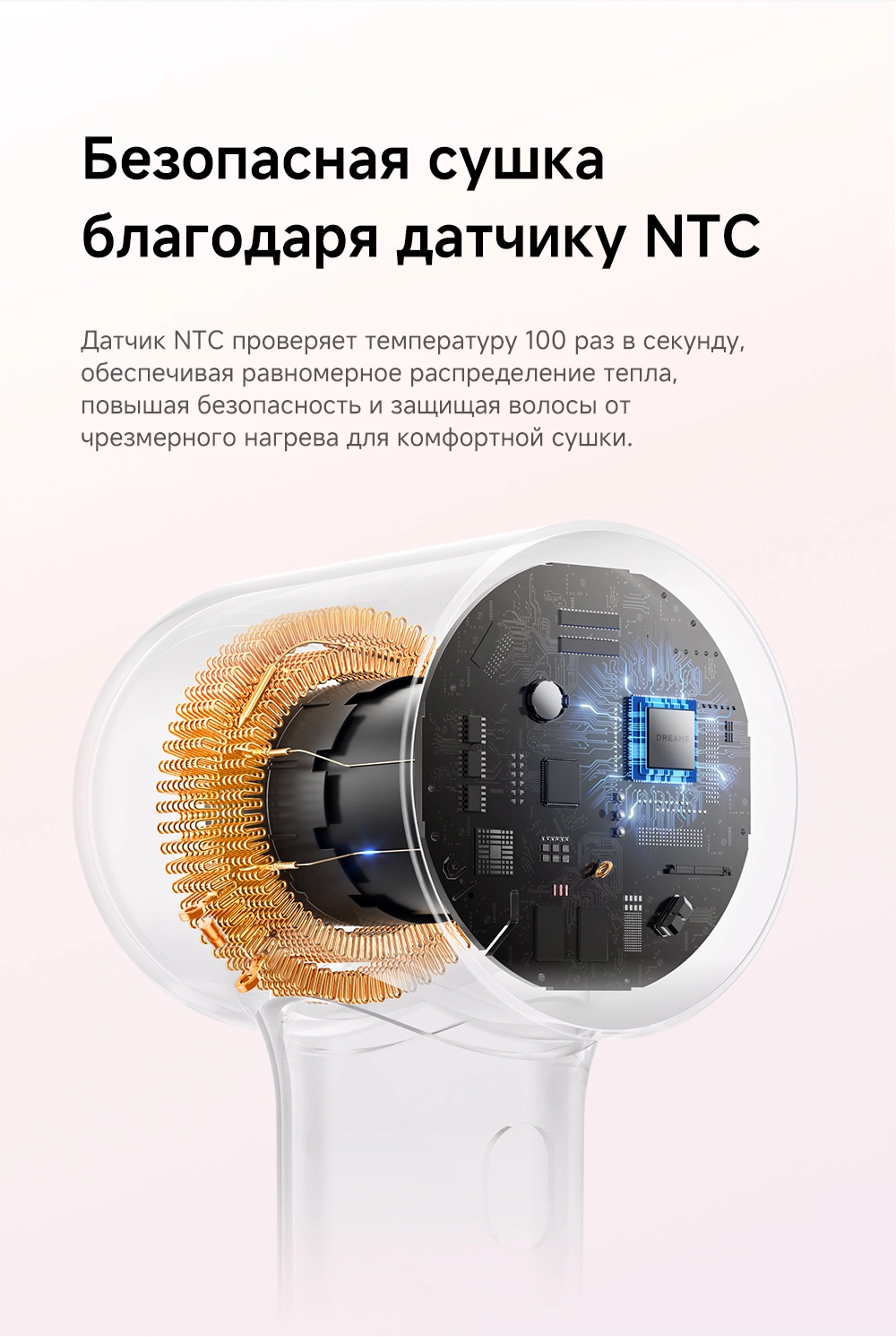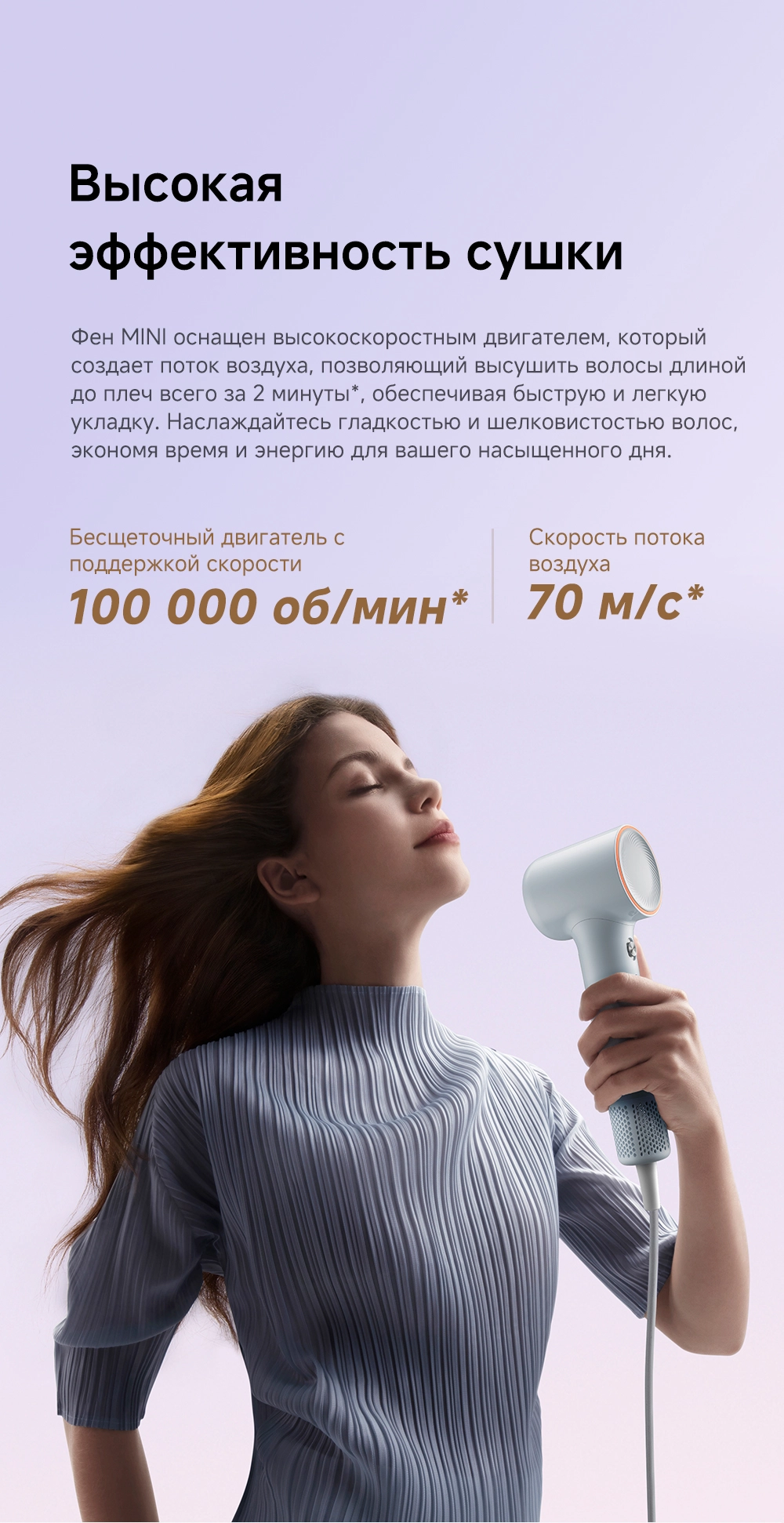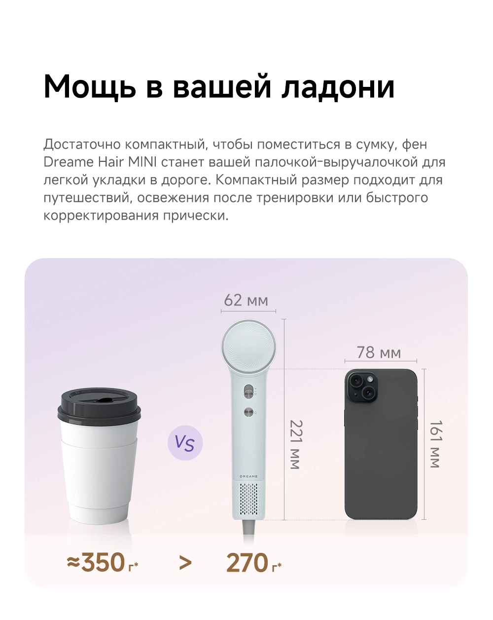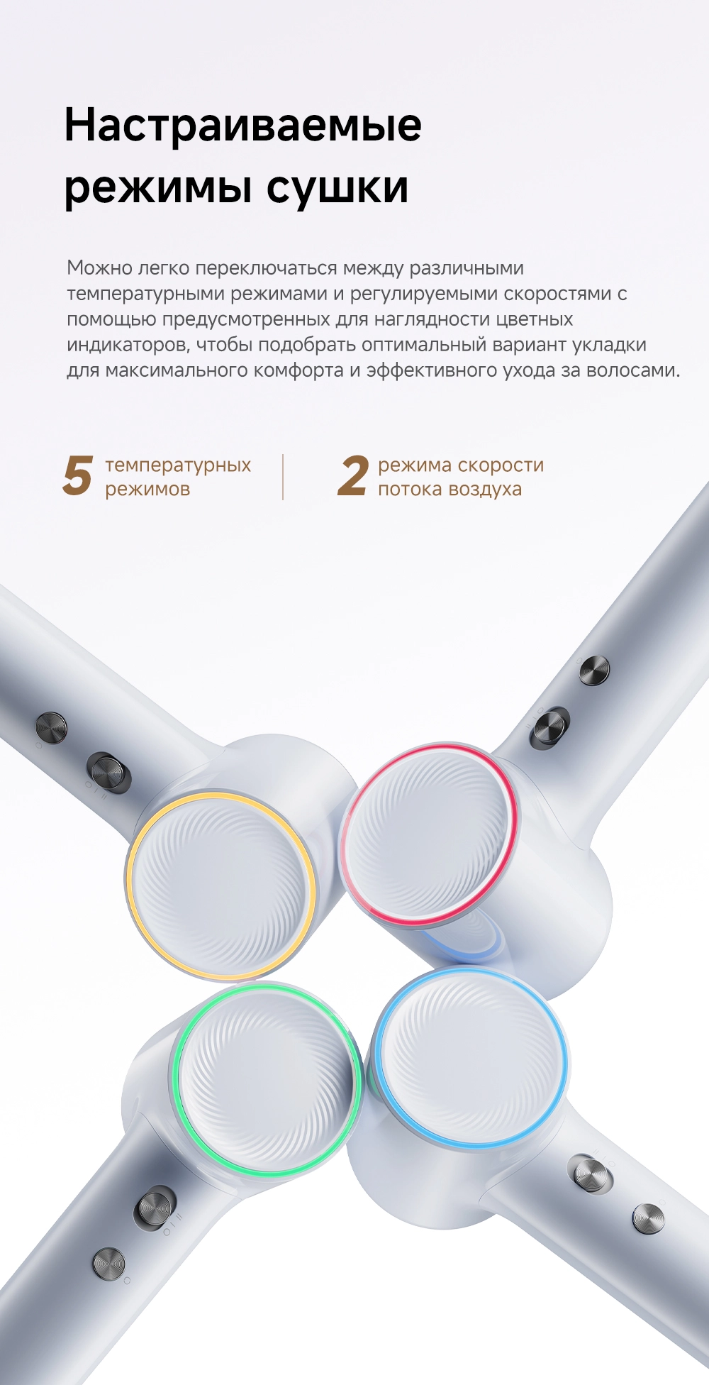 - Особенности: мощный воздушный поток, лёгкий вес, всего 270 грамм, компактный размер, высокая концентрация отрицательно заряженных ионов эффективно нейтрализует статическое электричество, разглаживая волосы, детский режим, разработанный для чувствительной кожи головы и тонких волос, обеспечивает мягкую сушку при контролируемой температуре 40°С
