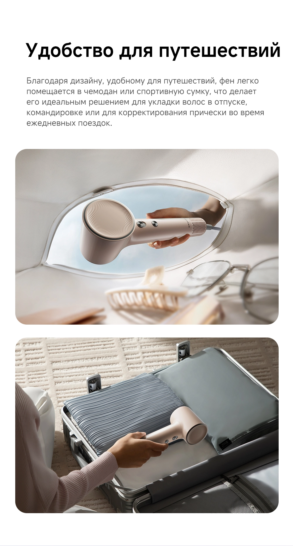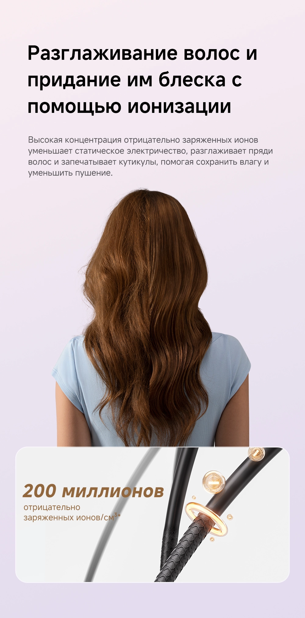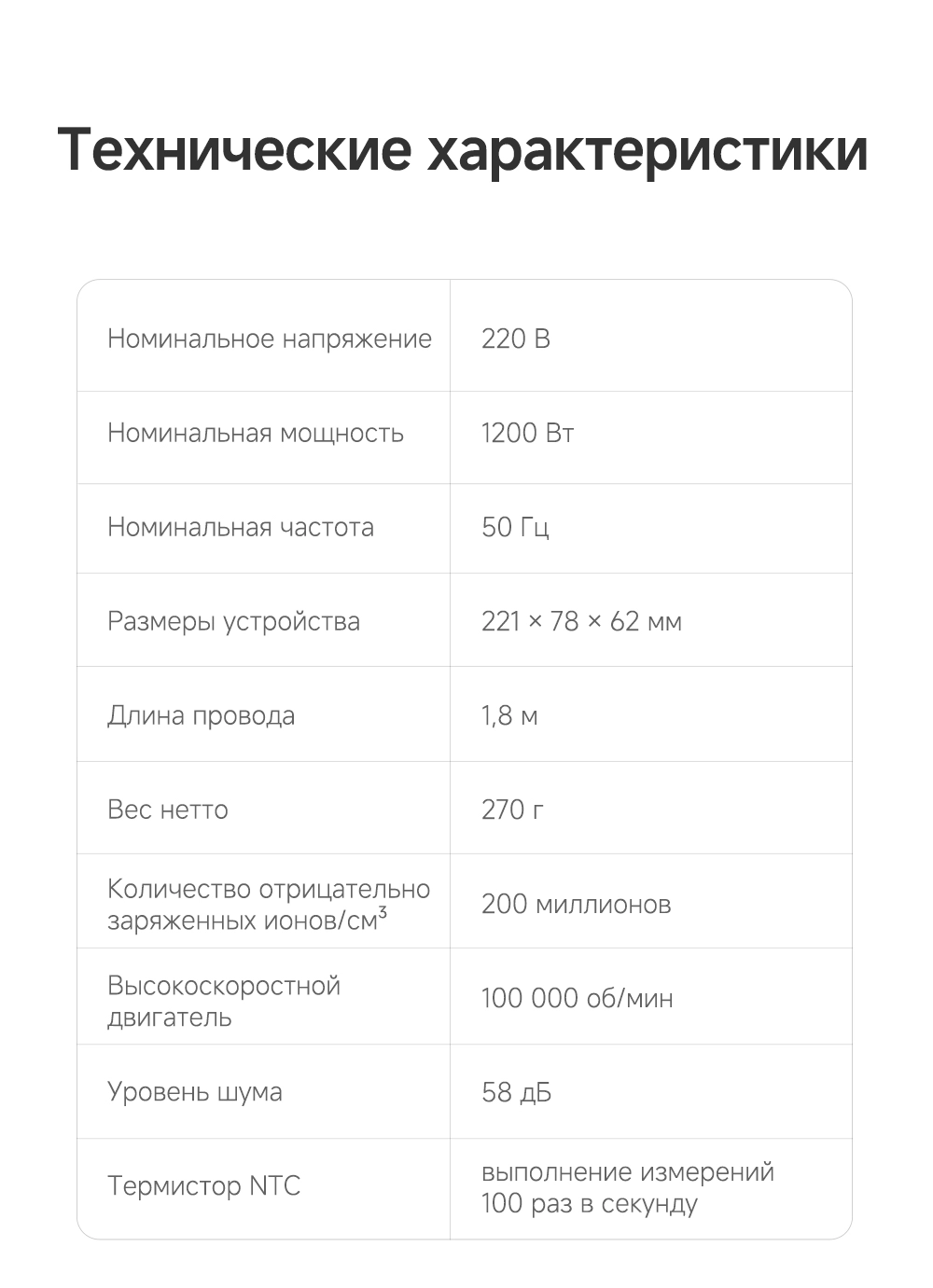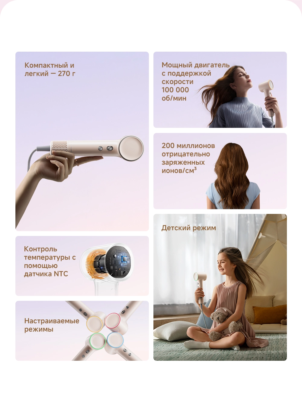 - Особенности: мощный воздушный поток, лёгкий вес, всего 270 грамм, компактный размер, высокая концентрация отрицательно заряженных ионов эффективно нейтрализует статическое электричество, разглаживая волосы, детский режим, разработанный для чувствительной кожи головы и тонких волос, обеспечивает мягкую сушку при контролируемой температуре 40°С
