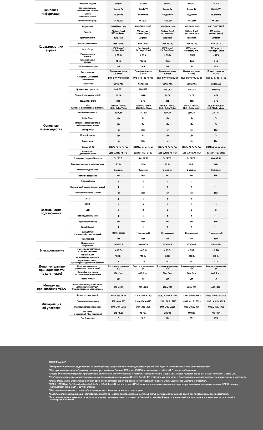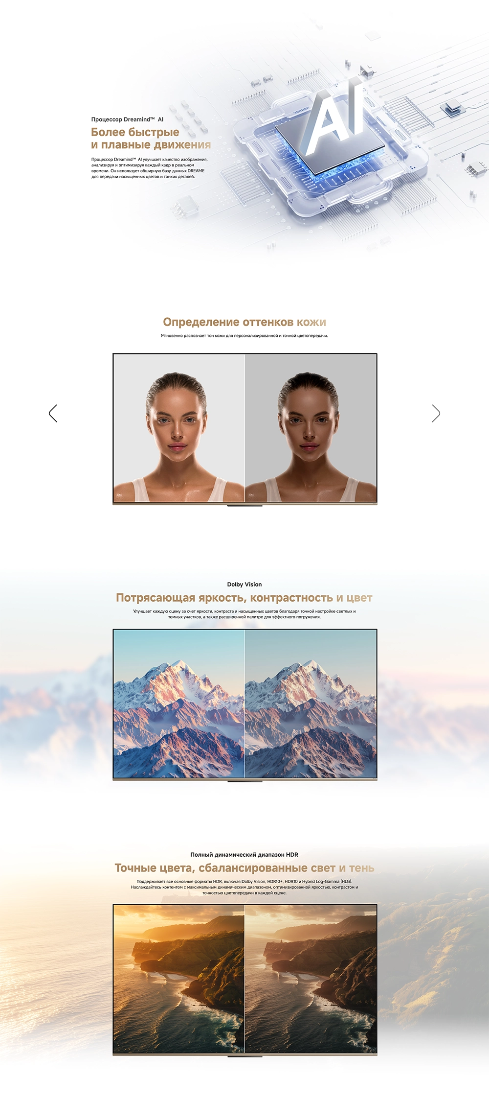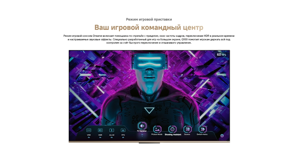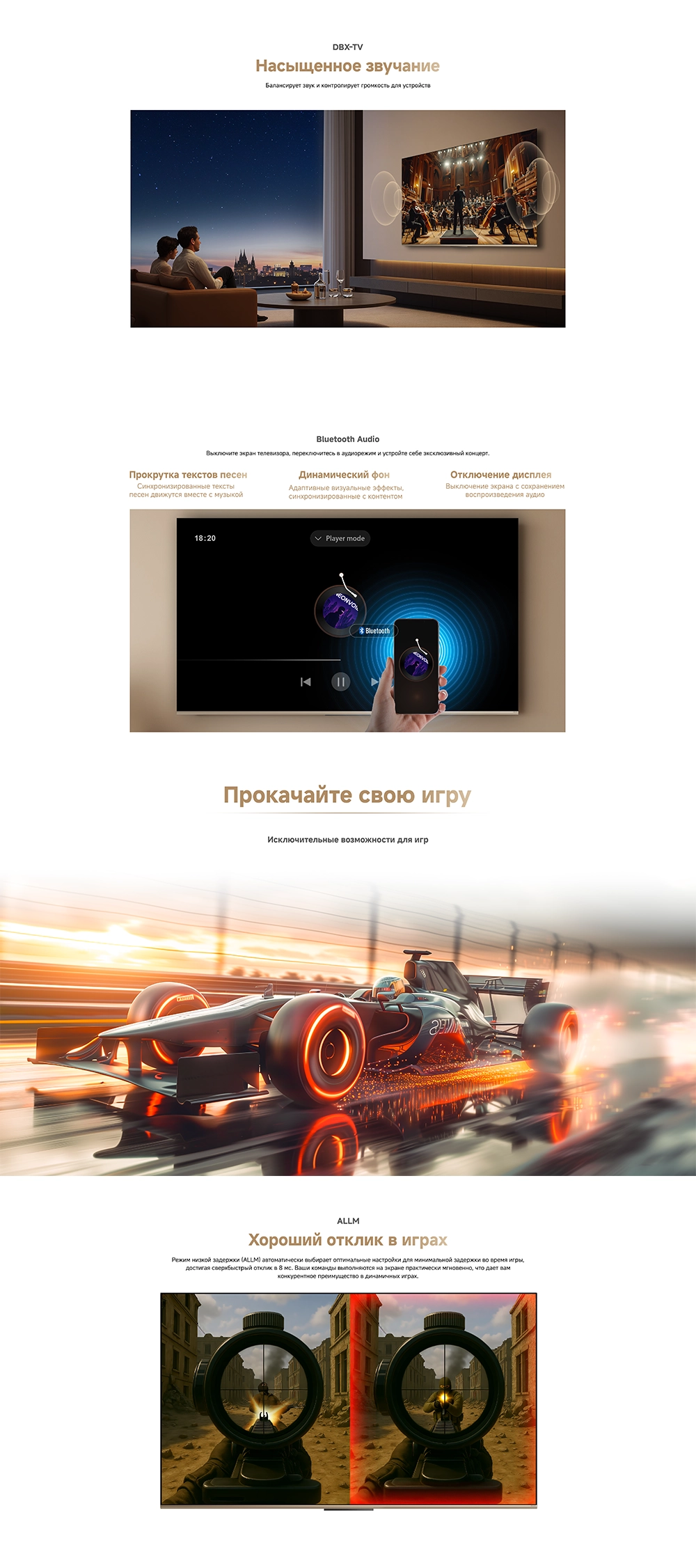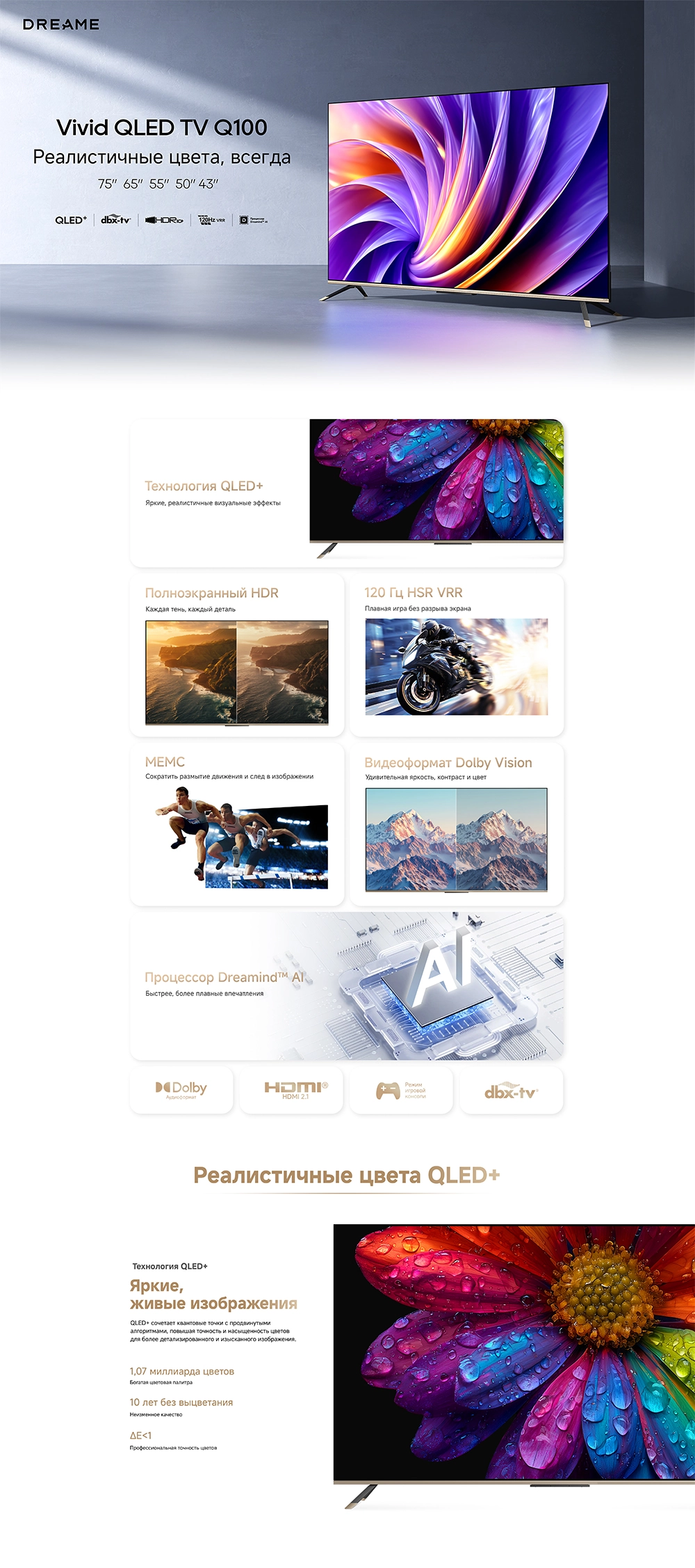 - Особенности: цветовая палитра 1.07 миллиарда цветов. 10 лет без выцветания. Технология на основе ИИ улучшает быстро движущиеся сцены, устраняя размытие и делая изображение плавным. Высокая частота обновления 120 Гц с технологией True Motion обеспечивает плавное и чёткое изображение. Режим игровой консоли Dreame включает помощника по стрельбе с прицелом, окно частоты кадров, переключение HDR в реальном времени и настраиваемые звуковые эффекты. Опция "Найти пульт"